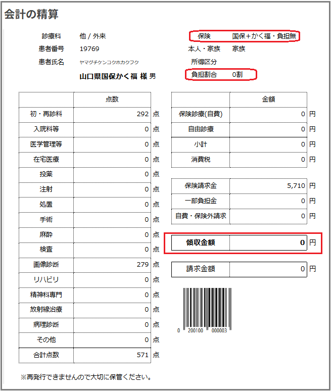 [かく福・負担無]の場合はレセプトの公費欄は空欄です