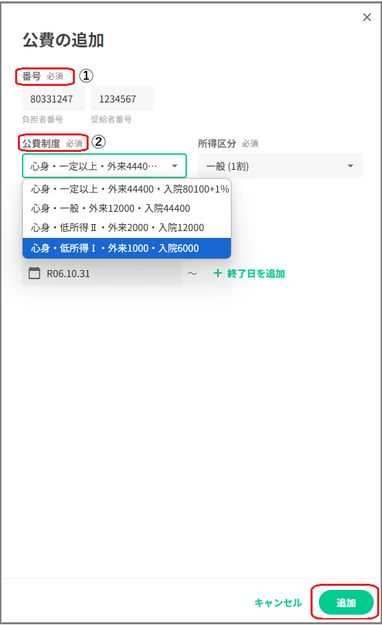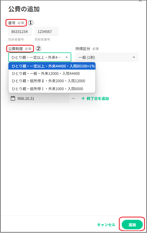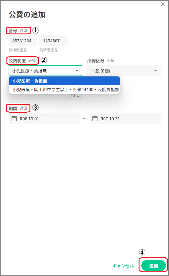 ①負担者番号・受給者番号を入力下さい。 ②負担者番号・受給者番号を入力すると、該当する公費制度が選択できるようになります。所得区分は、公費制度を選択すると自動で反映されます。公費制度は、医療証の一部自己負担金の金額を参照に入力します。 ③期間を登録します。 ④追加をクリックし、登録となります。 ⑤自己負担上限額の登録の必要はありません。