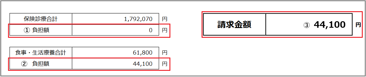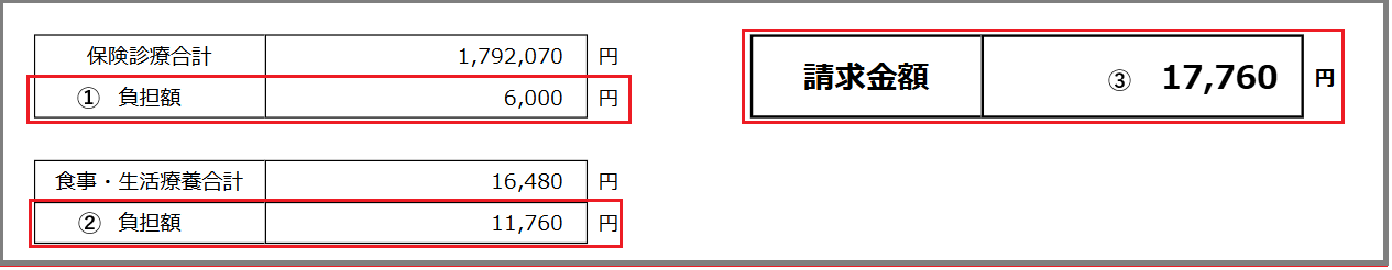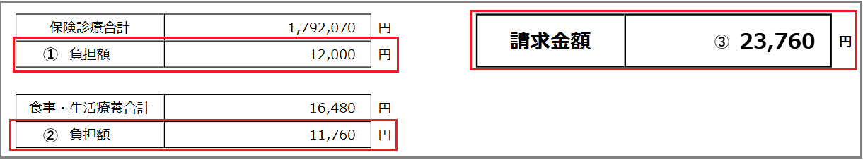 ① 入院費の自己負担額になります。12,000の上限額で金額が止まります。 ② 食事の負担額になります。 ③ すべてを合計した「請求金額」になります。