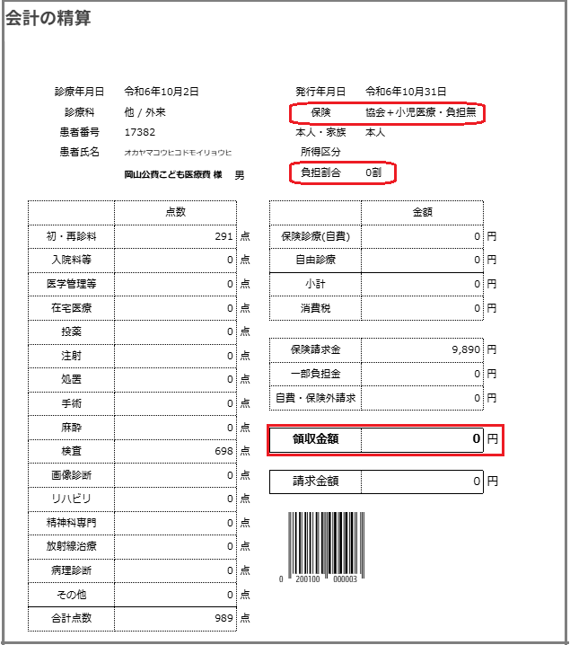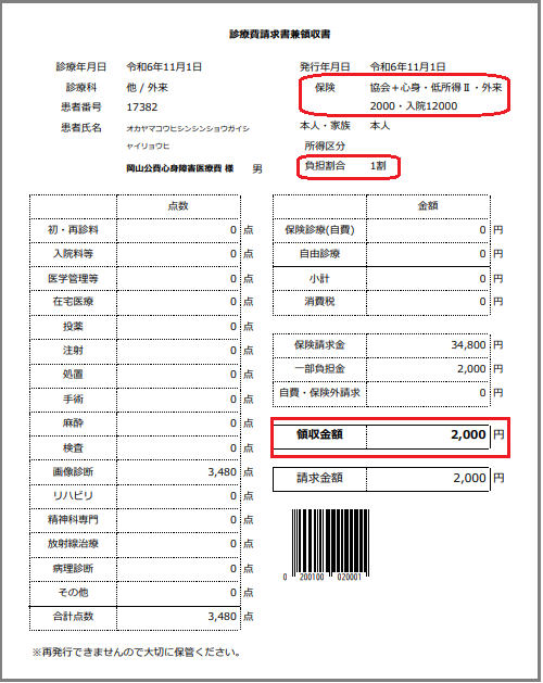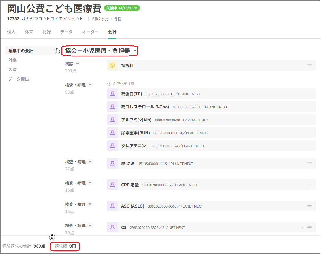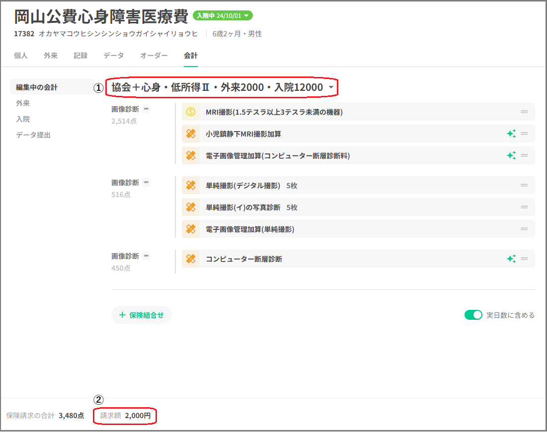 ① 使用されている保険と選択した地方公費の組み合わせが表記されます。 ② 請求額が表示されます。