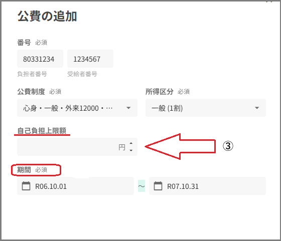 ①負担者番号・受給者番号を入力下さい。 ②負担者番号・受給者番号を入力すると、該当する公費制度が選択できるようになります。所得区分は、公費制度を選択すると自動で反映されます。 公費制度は、医療証の一部自己負担金の金額を参照に入力します。 ③自己負担上限額は登録の必要はありません。