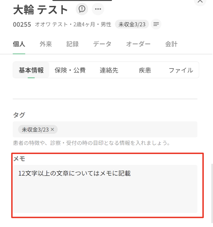 患者情報の「メモ」に文章を入力し、「更新」を押下する 任意の文章を入力し、更新を行う