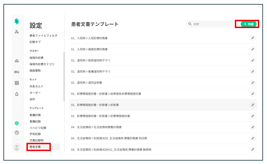 患者文書テンプレート一覧画面の右上 「作成」 ボタンを押下します