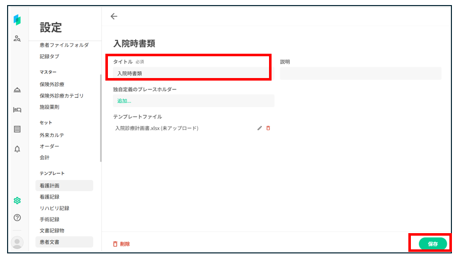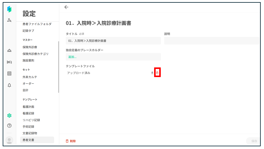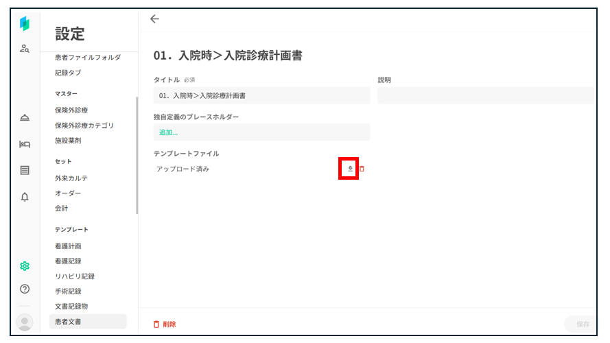 画面左側の 「⚙(設定)」→「患者文書」 を押下します