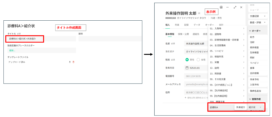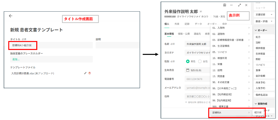 テンプレートを登録しておくことで、患者文書作成時に同じ形式の文書を簡単に作成できます。また、患者文書の引用項目(プレースホルダー)機能を利用することで、患者氏名・生年月日などの患者情報を文書内に自動引用することも可能です。