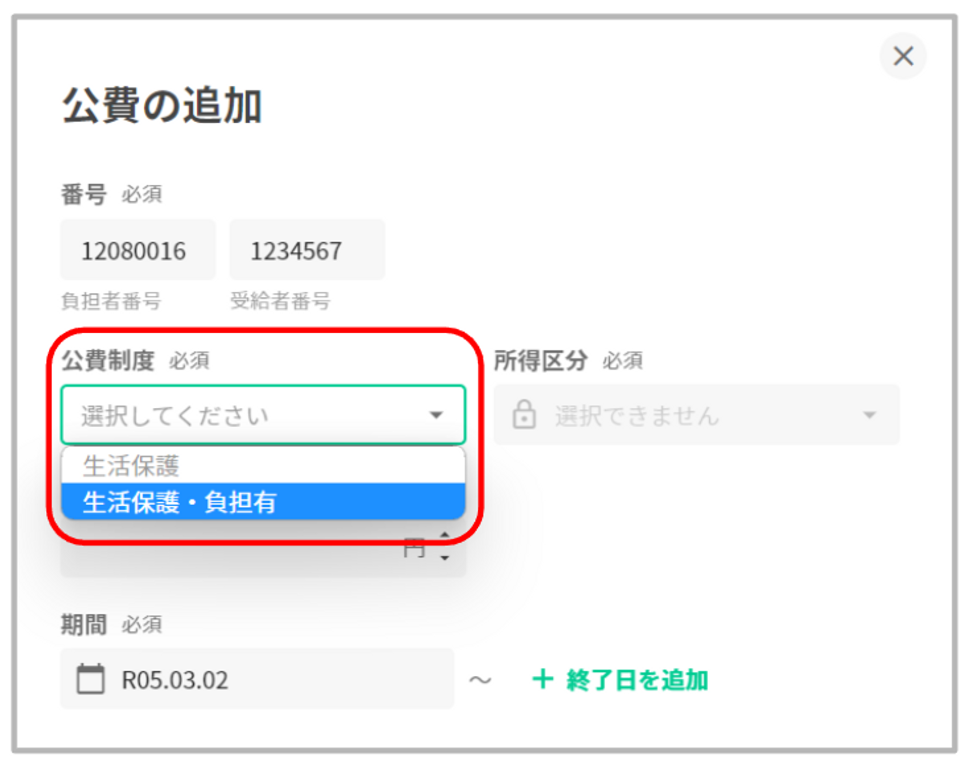 • 公費の追加で生活保護の登録をする際に「生活保護」と「生活保護・負担有」から任意の内容で登録することが可能となりました。生活保護で患者負担額が発生する場合は「生活保護・負担有」を選択して登録を行ってください。