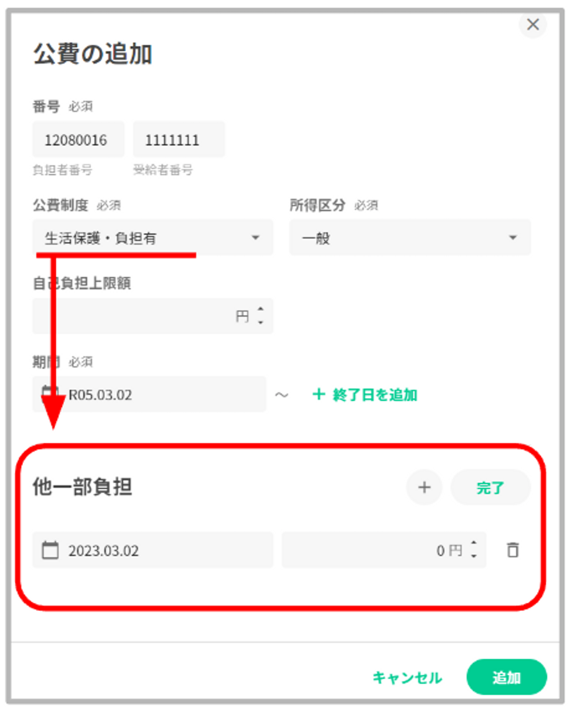 • 生活保護・負担有」の場合は「他一部負担」の追加画面が表示され上限額管理が可能です。