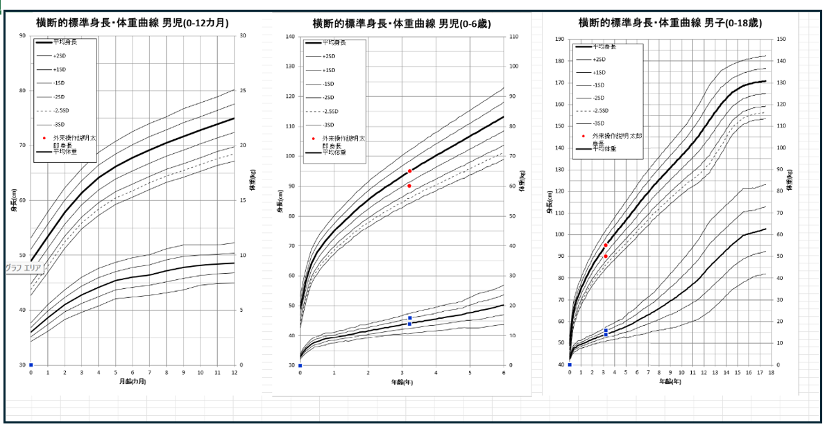 成長曲線のグラフは、身体情報(身長・体重・頭囲)を入力したうえで、患者文書テンプレートからエクセル出力可能です。出力時点で登録されているデータが自動で反映されます。