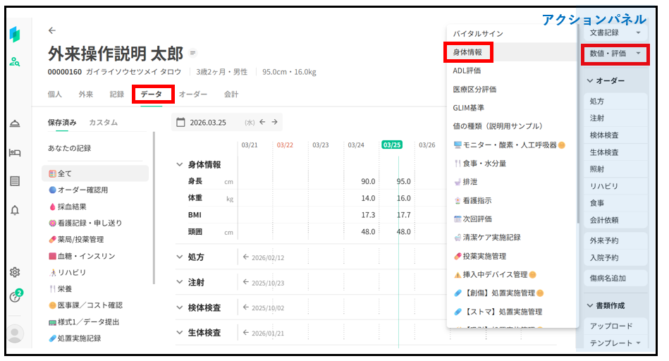 画面右のアクションパネルから「数値・評価」→「身体情報」を選択する