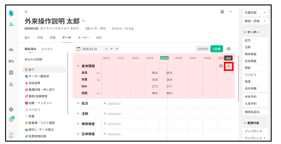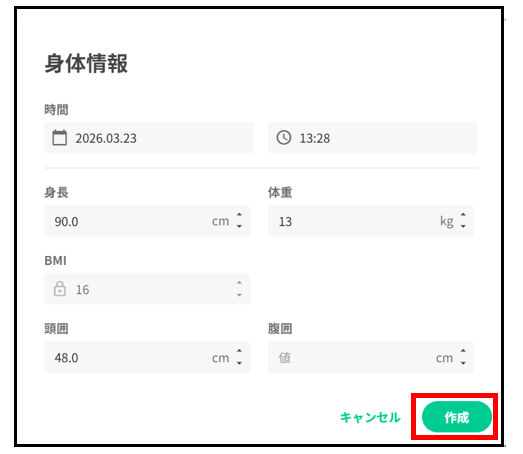 日時および身体情報(身長・体重・頭囲)を入力し、【作成】を押下する