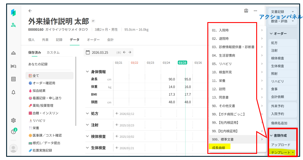 画面右のアクションパネルから「書類作成」→「テンプレート」を選択し、成長曲線のテンプレートをダウンロードする