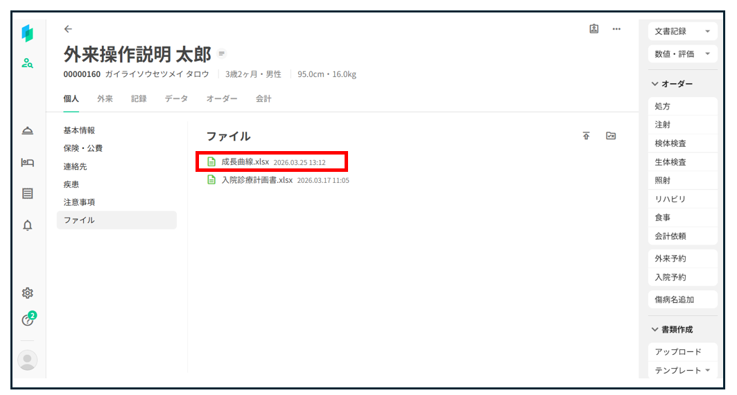 アップロードしたファイルが、患者の「ファイル」画面に登録される