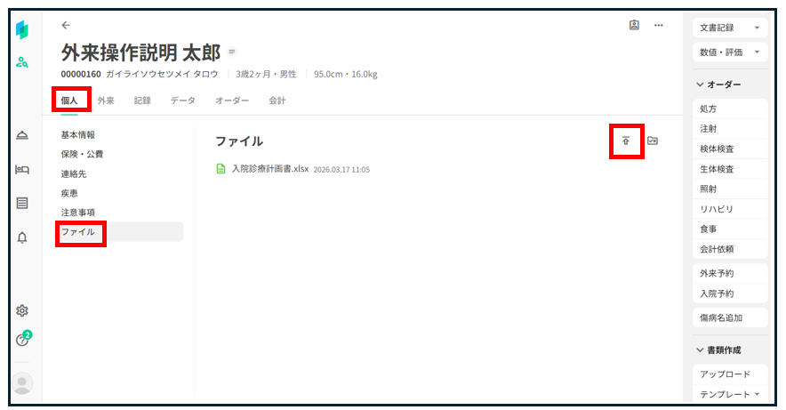 患者画面の「個人」タブ→「ファイル」を開く