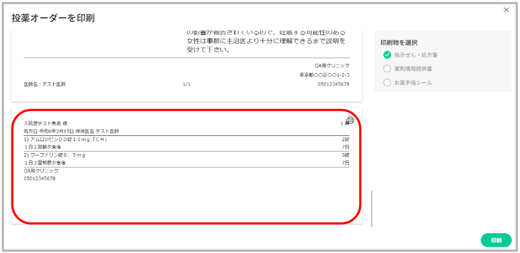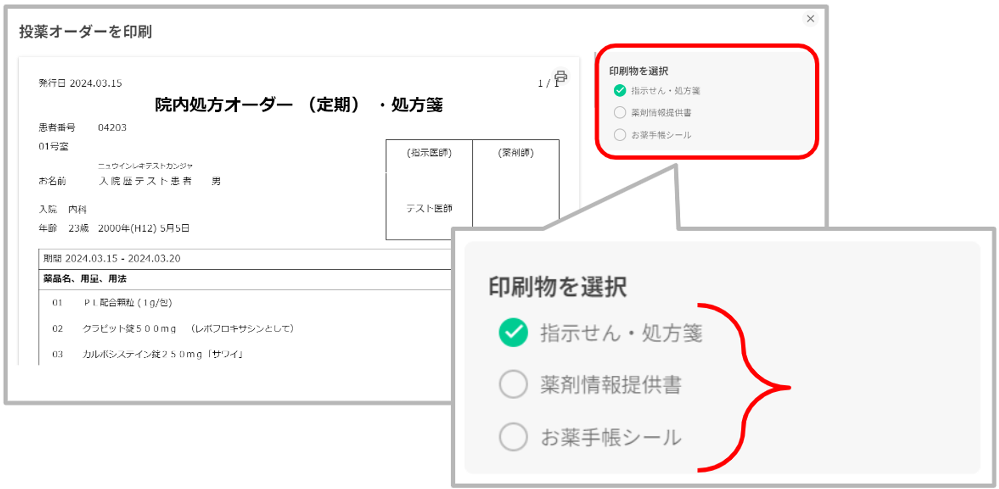 投薬オーダーの印刷プレビュー画面で、処方内容に対応した「オーダー処方箋」「薬剤情報提供書」「お薬手帳シール」を確認することが可能です。