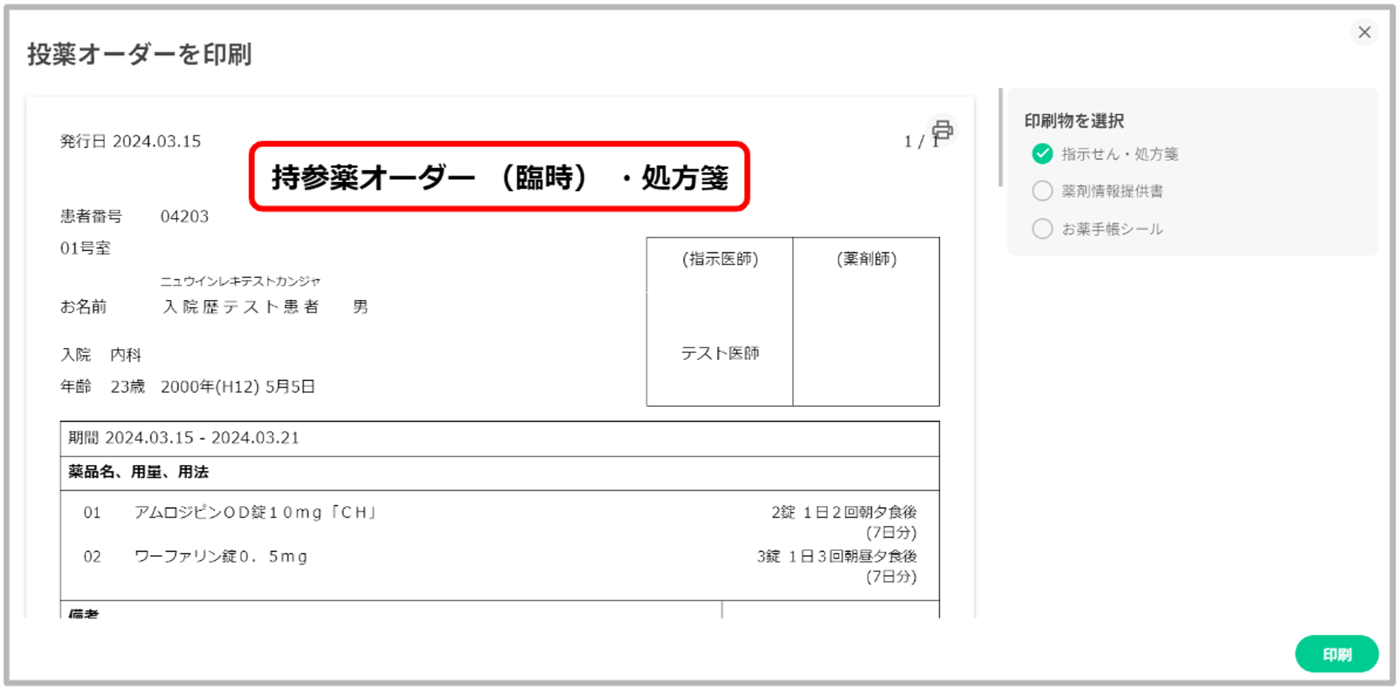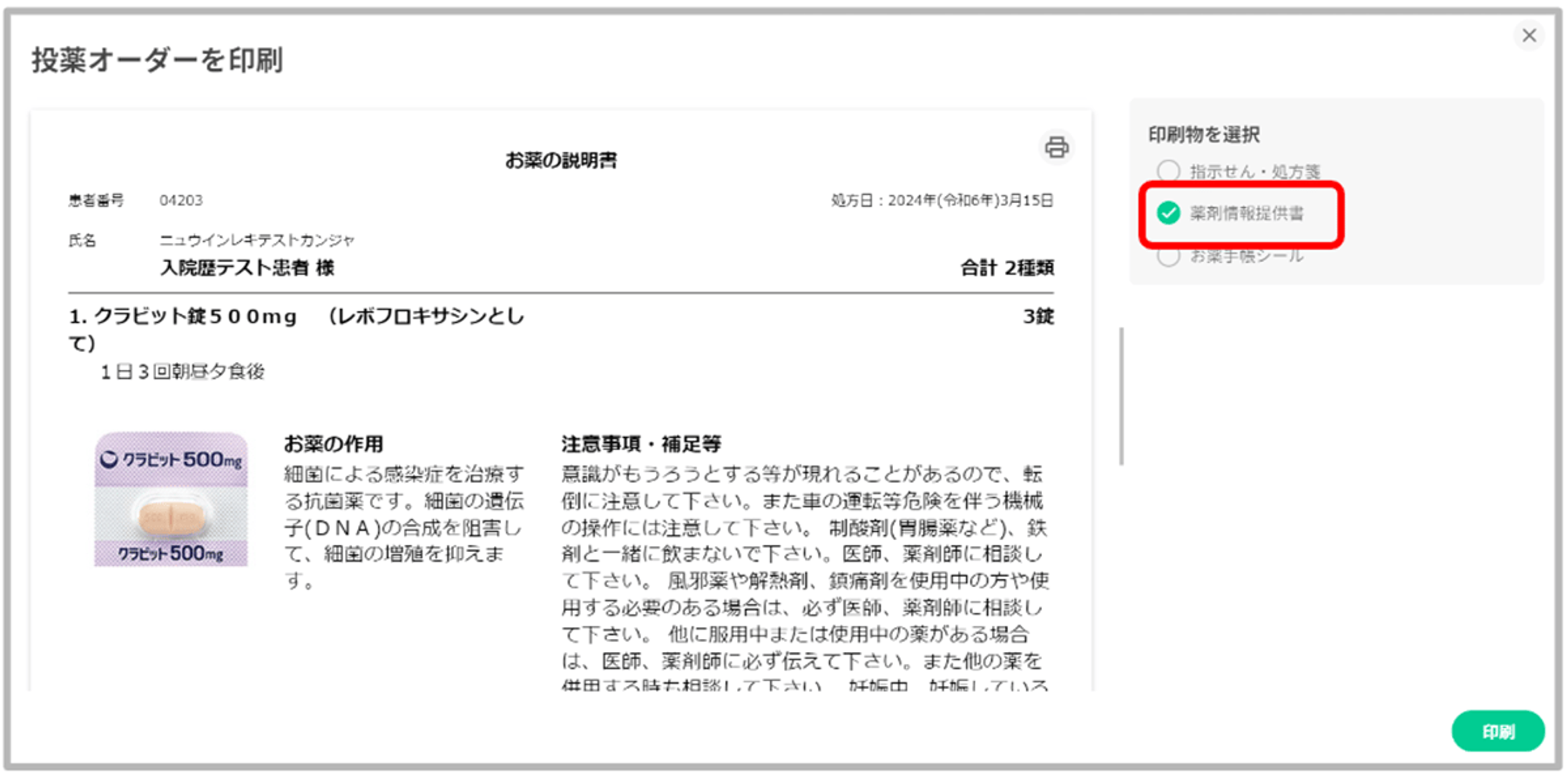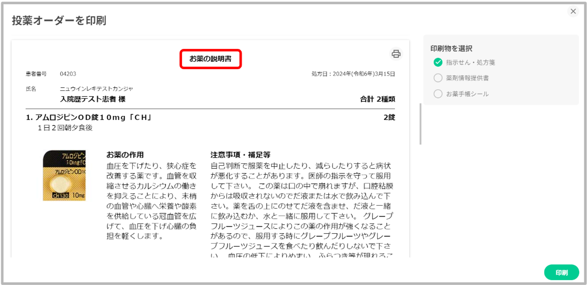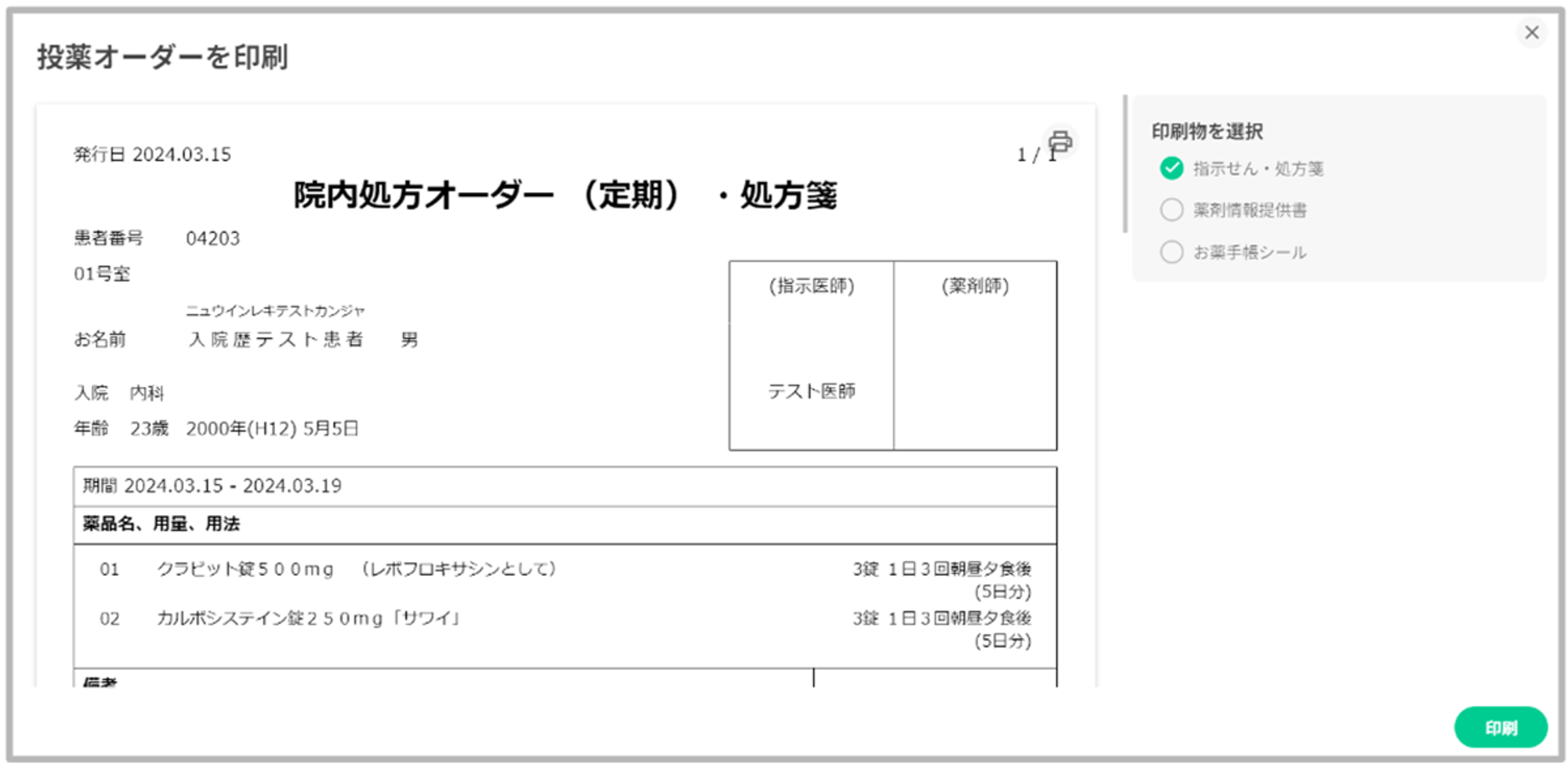 印刷物の選択項目に「薬剤情報提供書」「お薬手帳シール」の選択肢を追加いたしました。デフォルトは「指示箋・処方箋」のみ有効となっているので、印刷したい項目を有効にし印刷を行ってください。