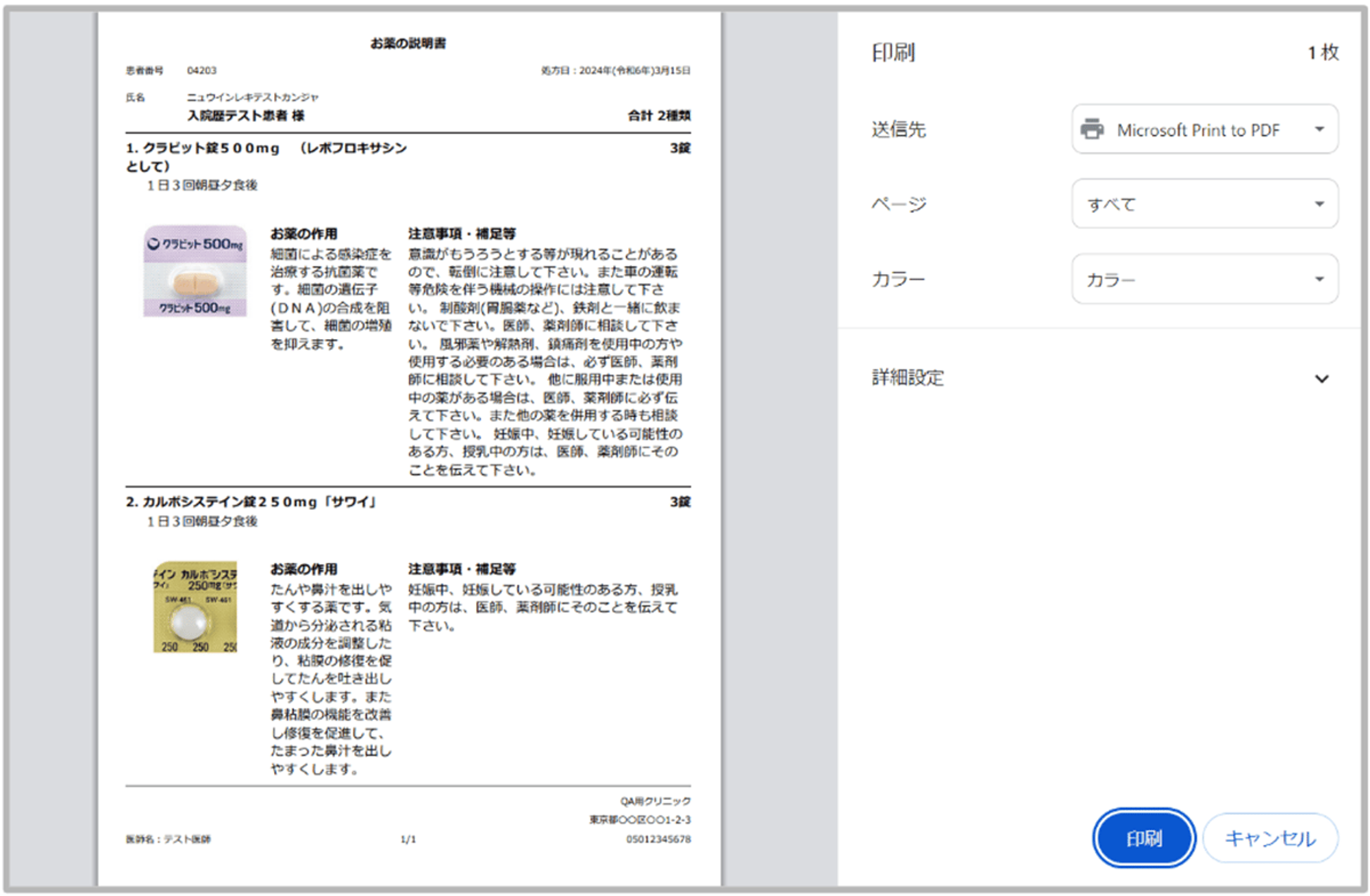 入院中の患者様へ服薬指導を行う際など、必要に応じて印刷して使用することが可能です。