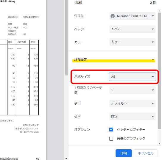 6.印刷プレビュー画面の詳細設定より、各印刷物に該当する用紙サイズを指定し、「印刷」ボタンより印刷を行ってください。 なお、Google Chromeの仕様で前回の印刷設定が引き継がれるため、正しい用紙サイズが設定されているか必ず確認してください。