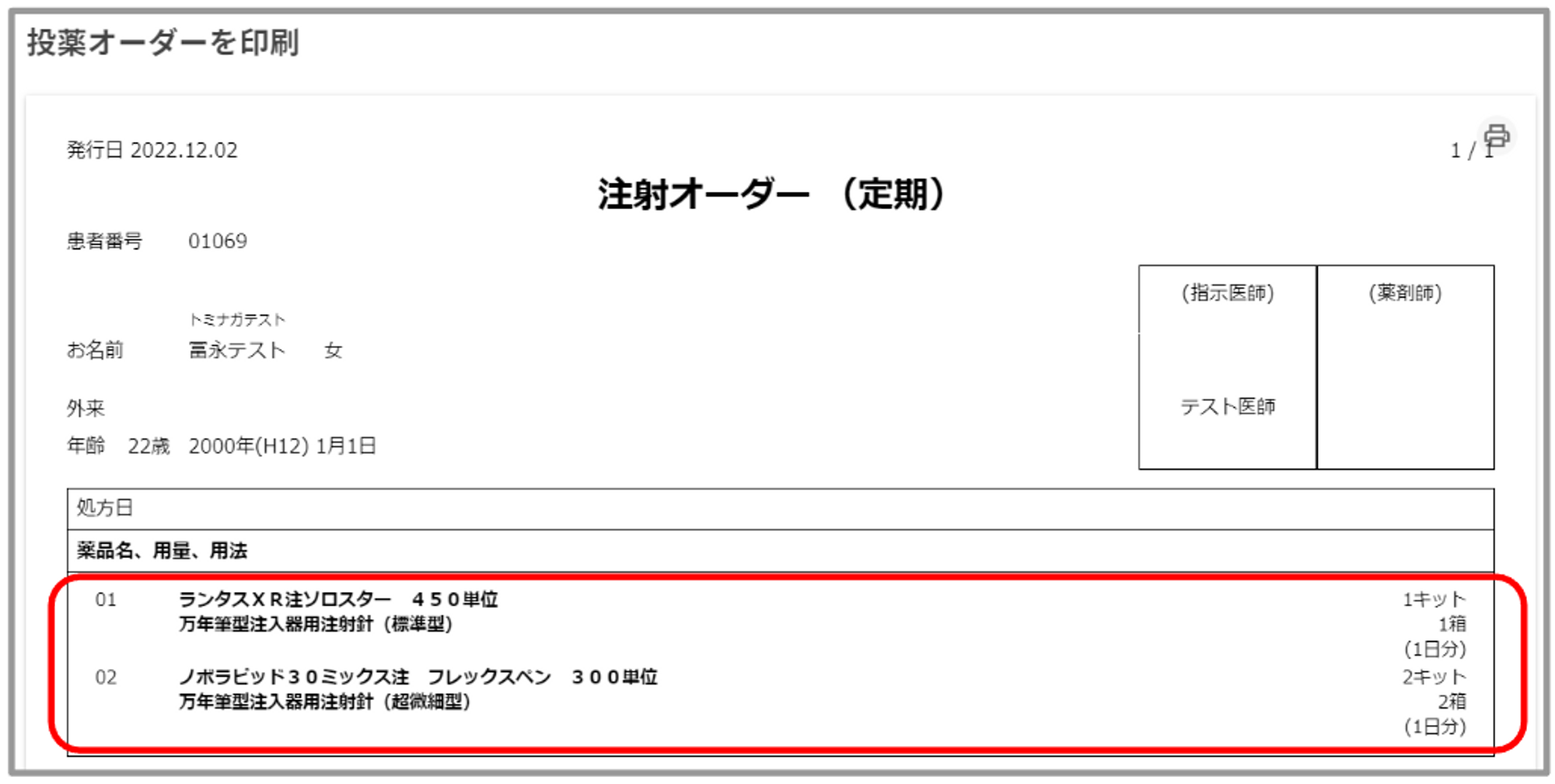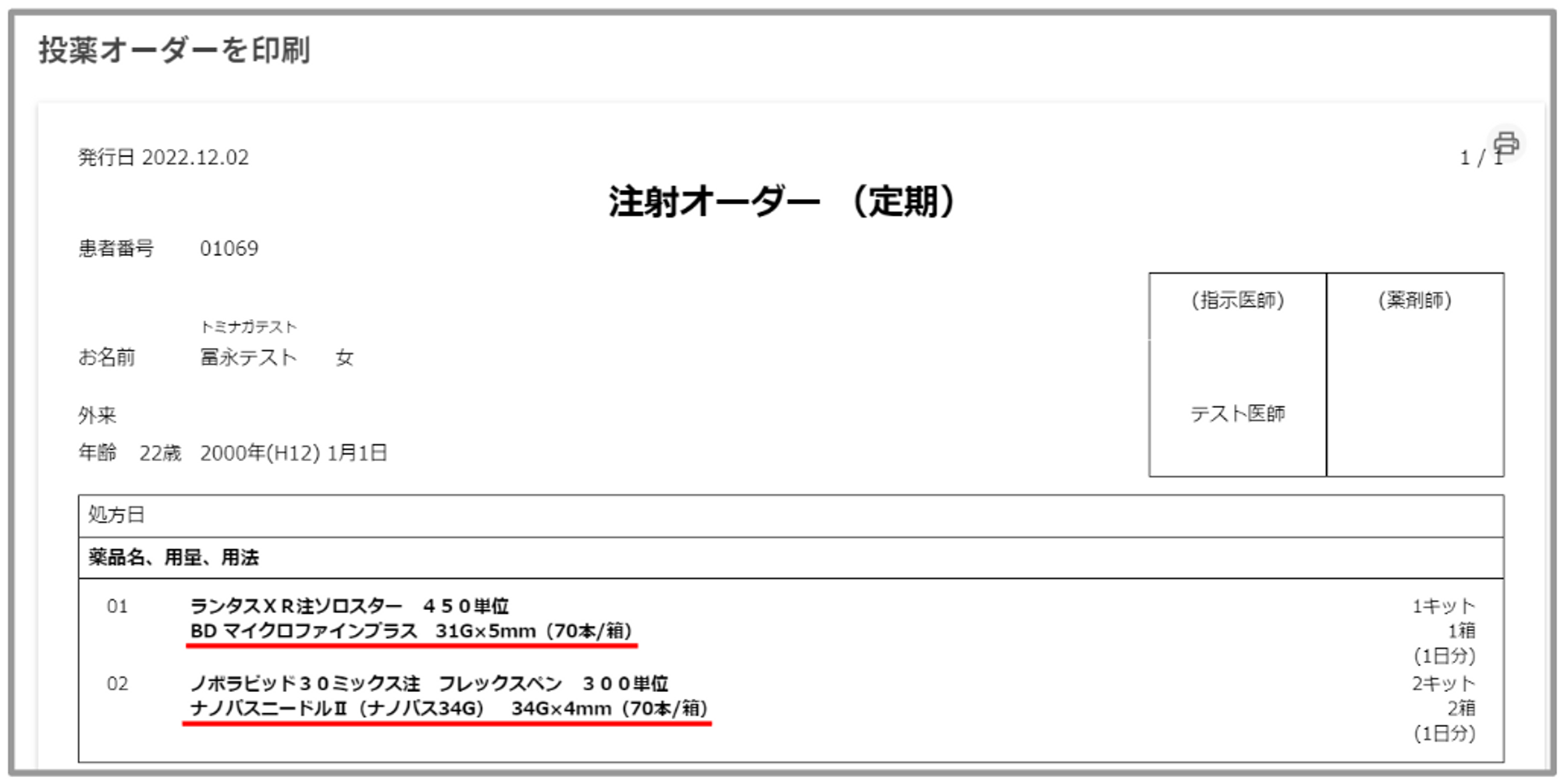 指示箋を印刷すると、医薬品に続いて特定器材が印字されます。