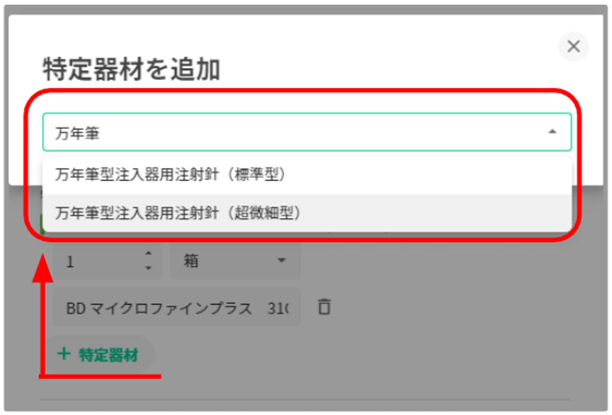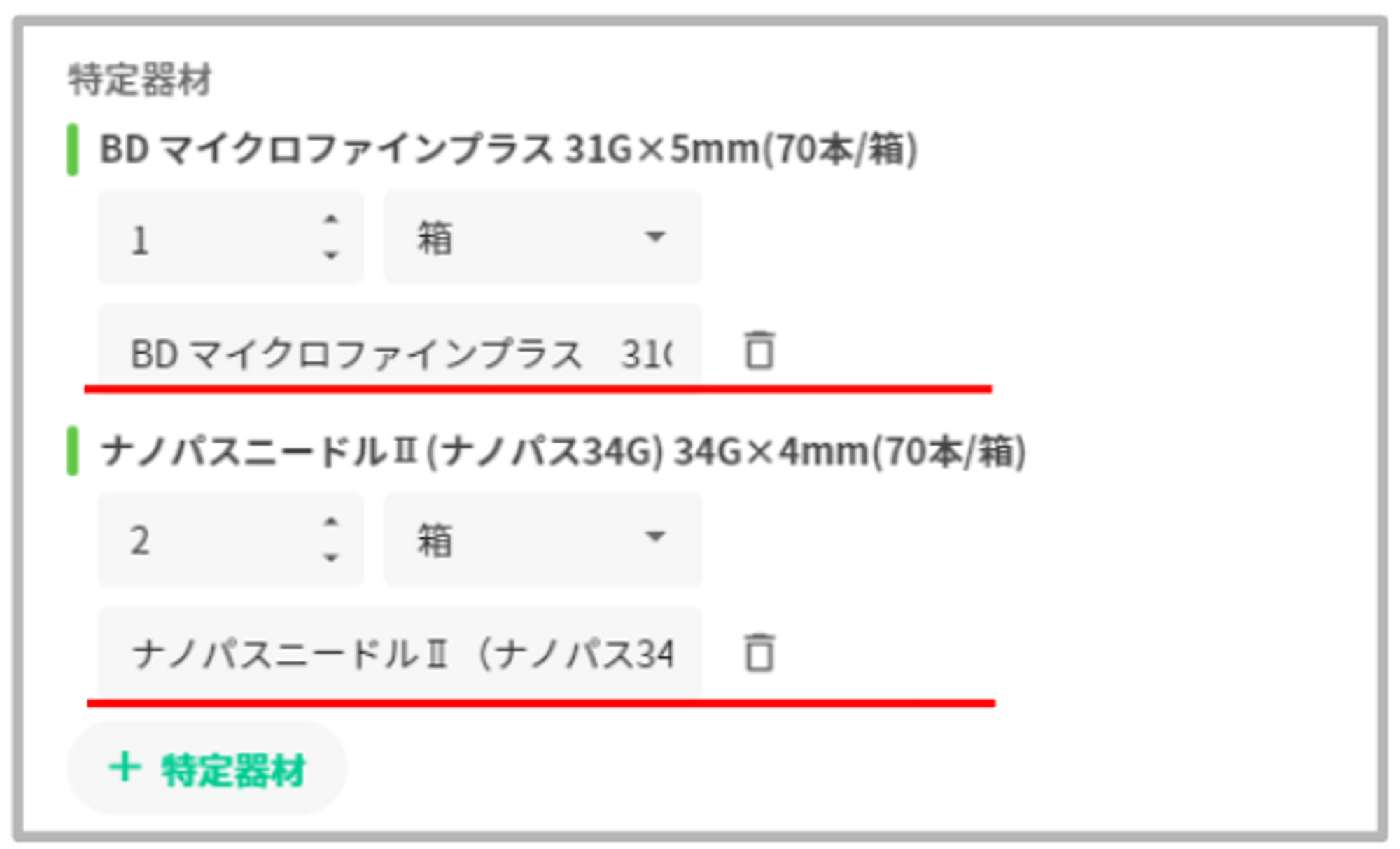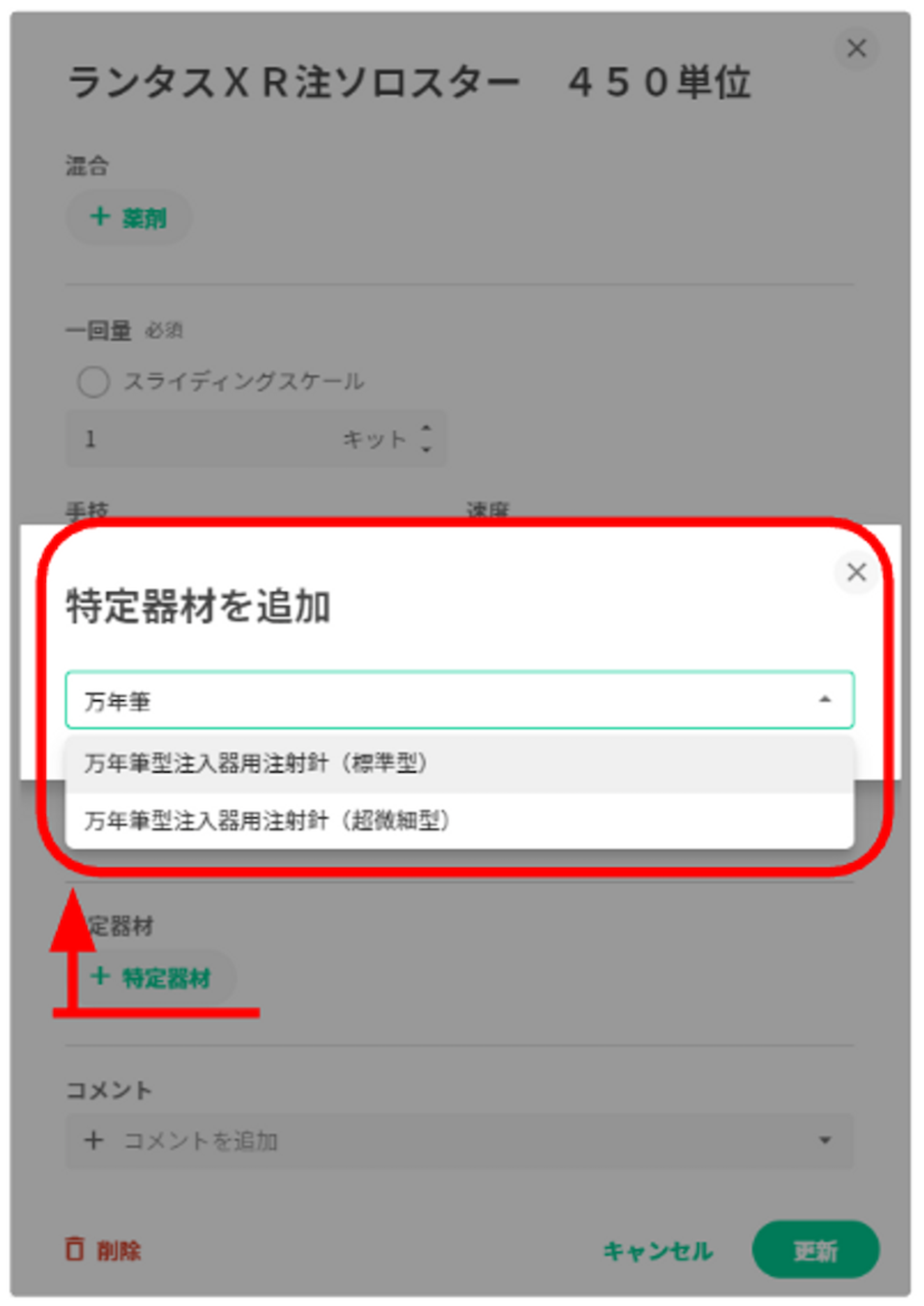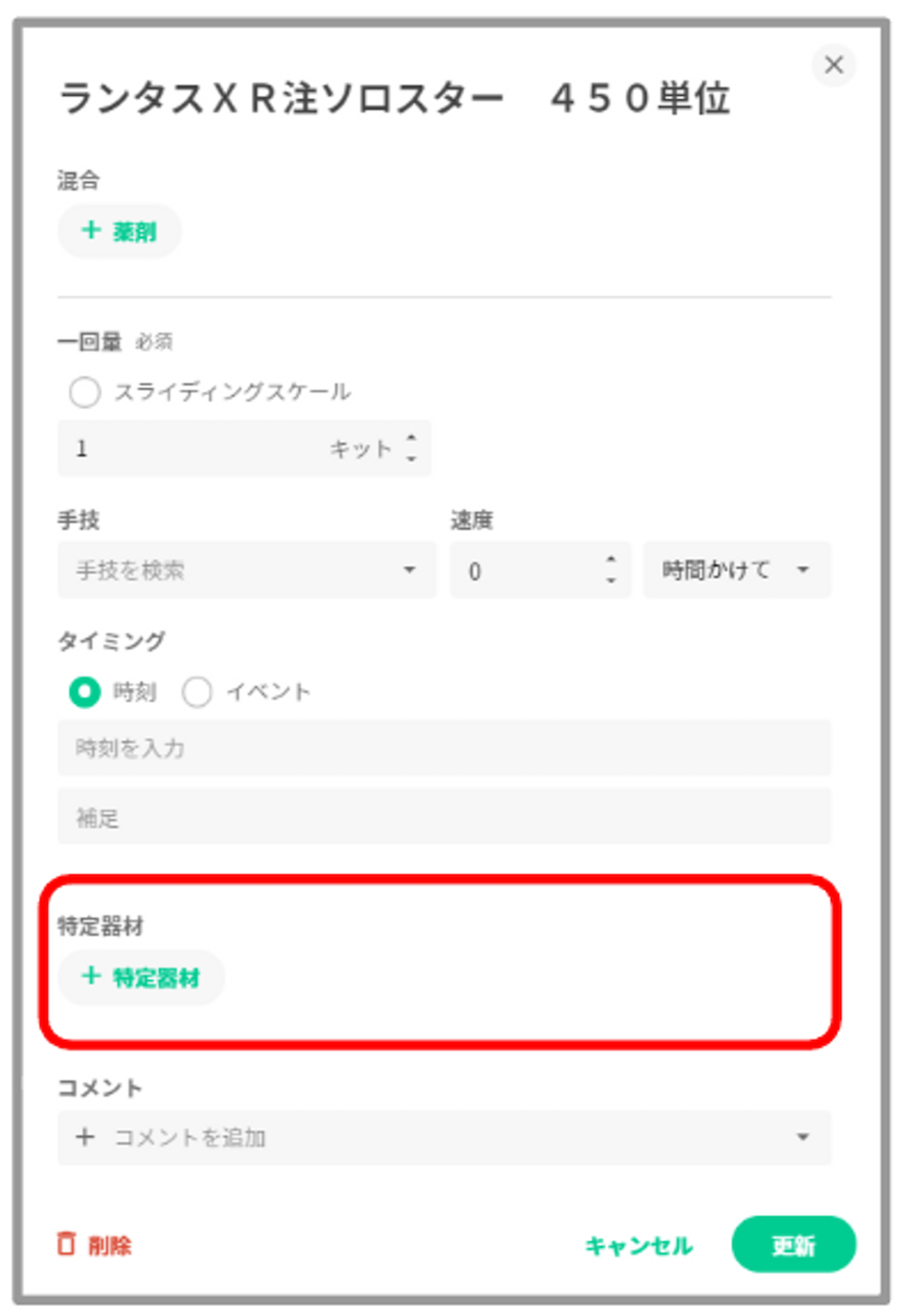 注射薬の場合のみ、数量や手技を設定する画面に特定器材を追加する欄が表示されます。