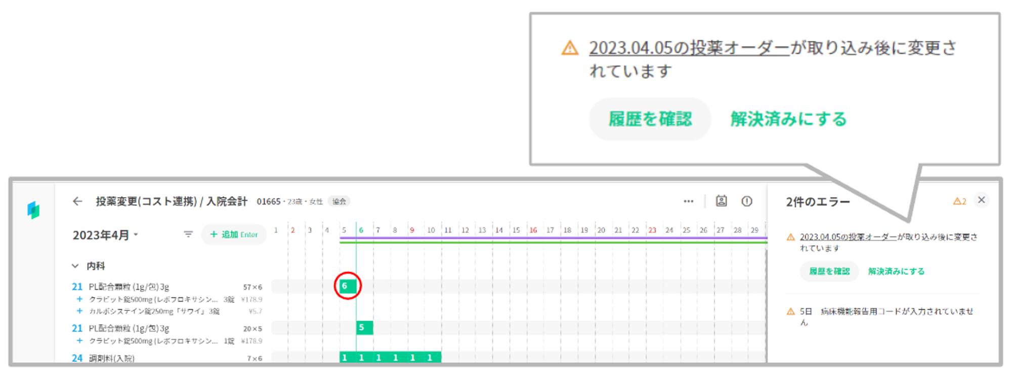 コスト連携後に投薬オーダーを変更した場合は、コストカレンダー(以下、コスカレ)で確認メッセージが表示されます。