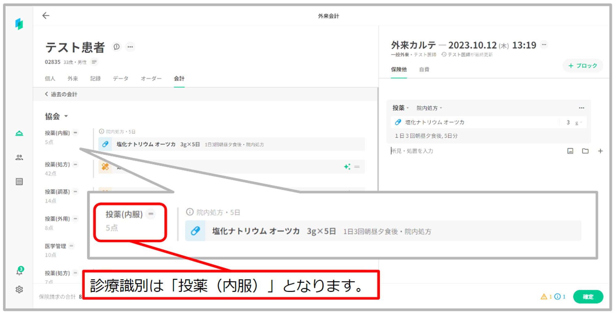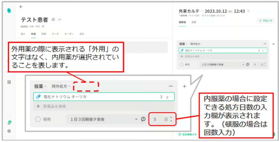 ①「塩化ナトリウム オーツカ」を処方し、剤形欄で表示される剤形から「内用薬」を選択する。