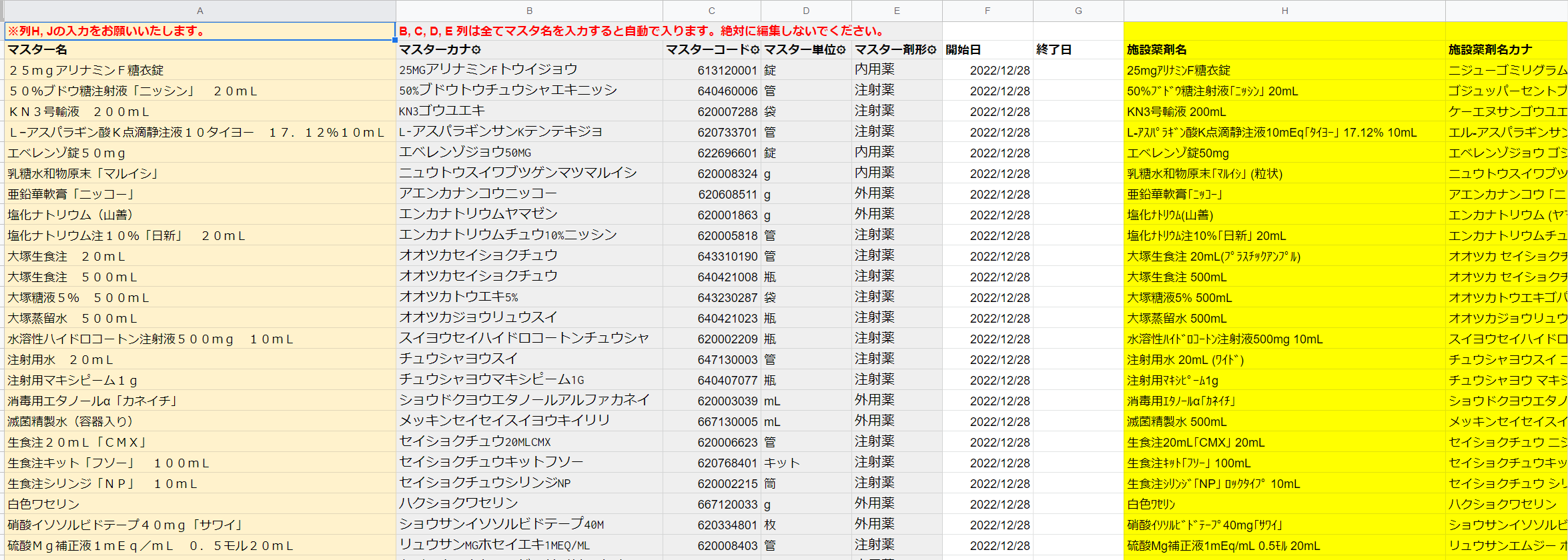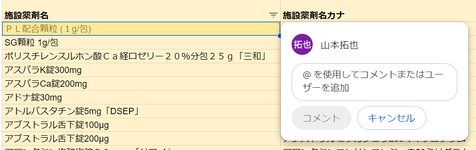 2.ヘンリーより共有した当該スプレッドシートについて以下の内容についてご確認頂きます。 - H列:施設薬剤名 - デフォルトではヘンリーにて厚労省マスター名と同様の名前を登録させて頂きますが、任意で施設薬剤名を変更いただくことは可能です(変更したい際は、スプレッドシートのコメントにて施設薬剤名の記入をお願い致します)。