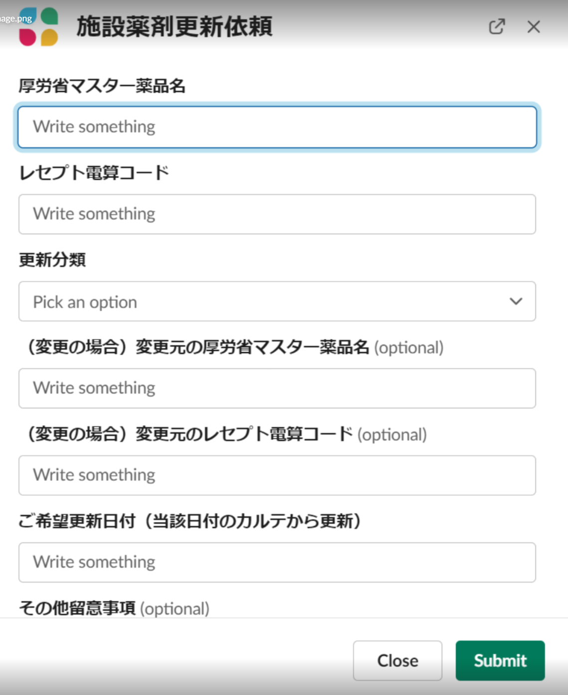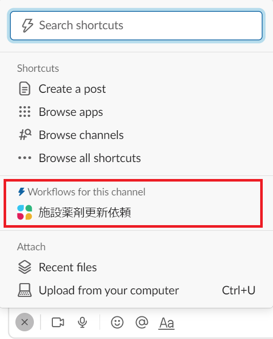 Slackの「+」ボタンより「施設薬剤更新依頼」のワークフローをクリックしてください