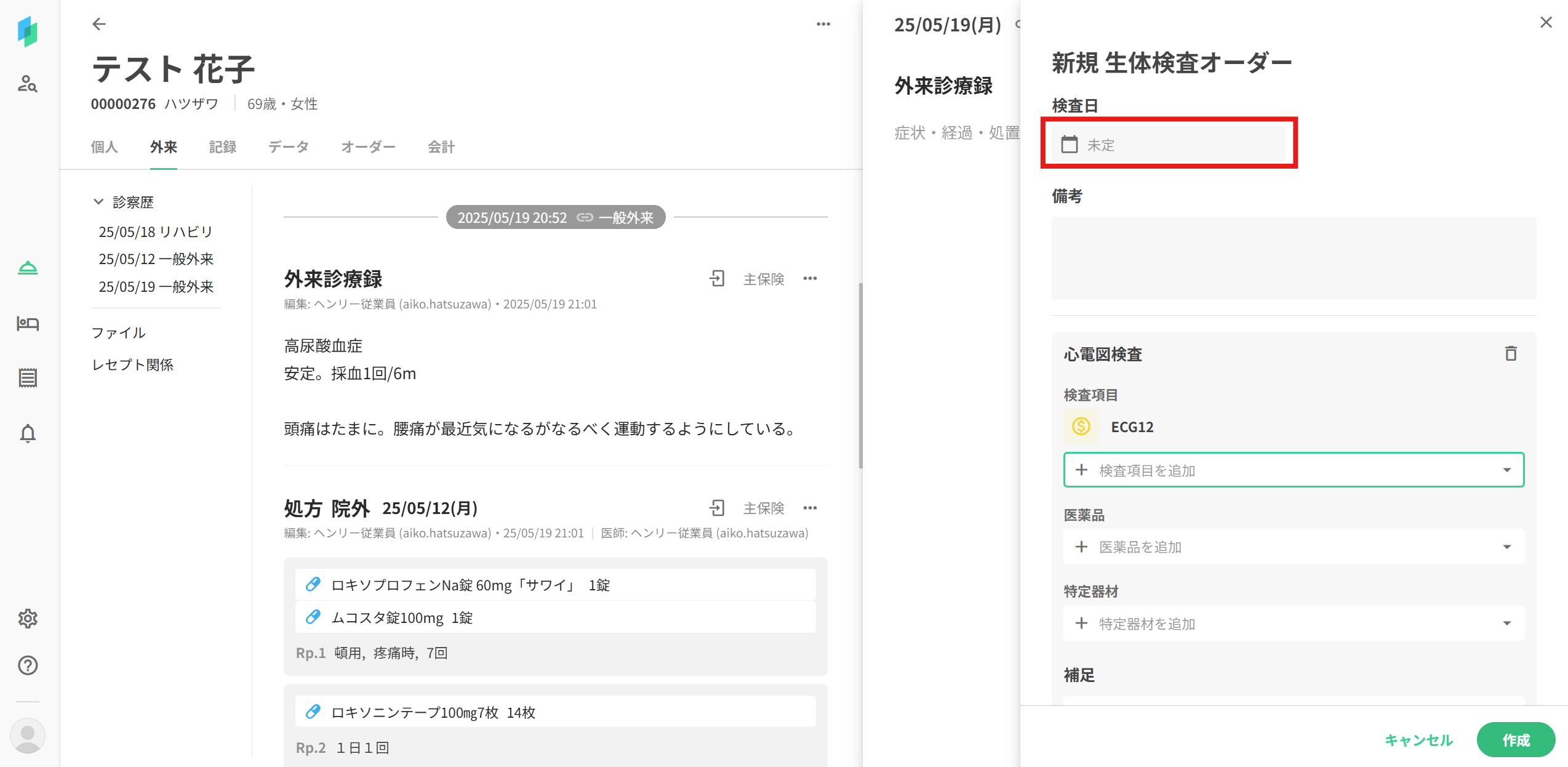 任意の日付の外来カルテを開きます。右側のアクションパネルから作成したいオーダーを選択すると、その日付があらかじめ入力されたオーダー画面が開くので、日付を削除します。