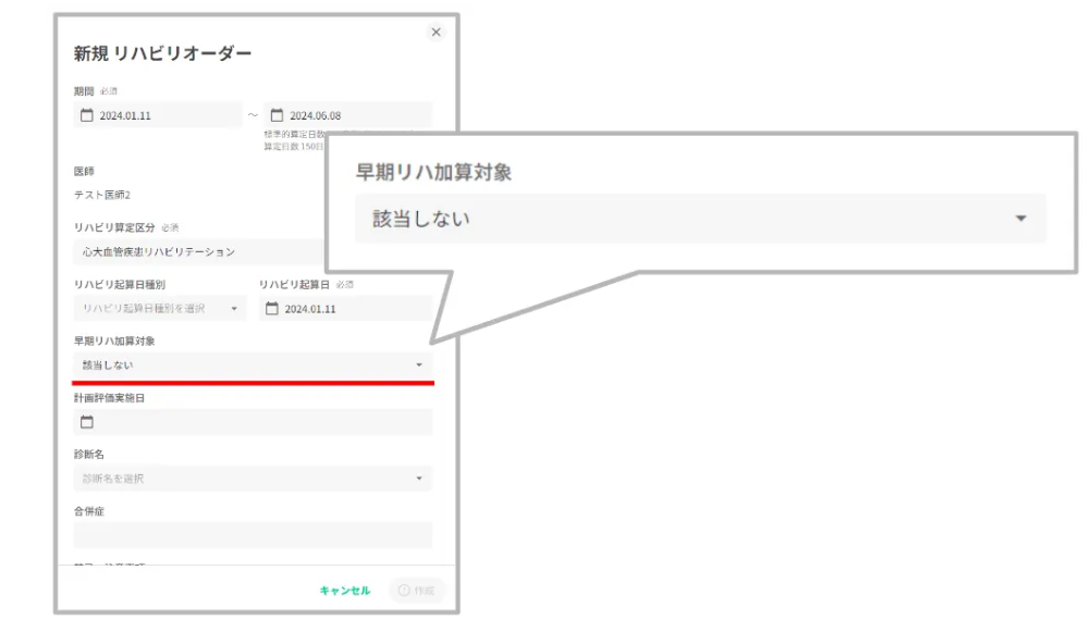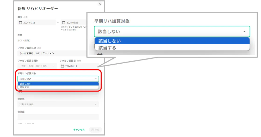 「早期リハ加算対象」欄のデフォルト選択は「該当しない」となります。任意の項目を選択し、オーダーの作成を行ってください。