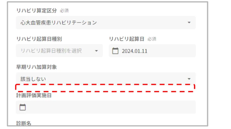「早期リハ加算対象」欄で「該当しない」を選択した場合、「加算起算日種別」欄と「加算起算日」欄は非表示となります。