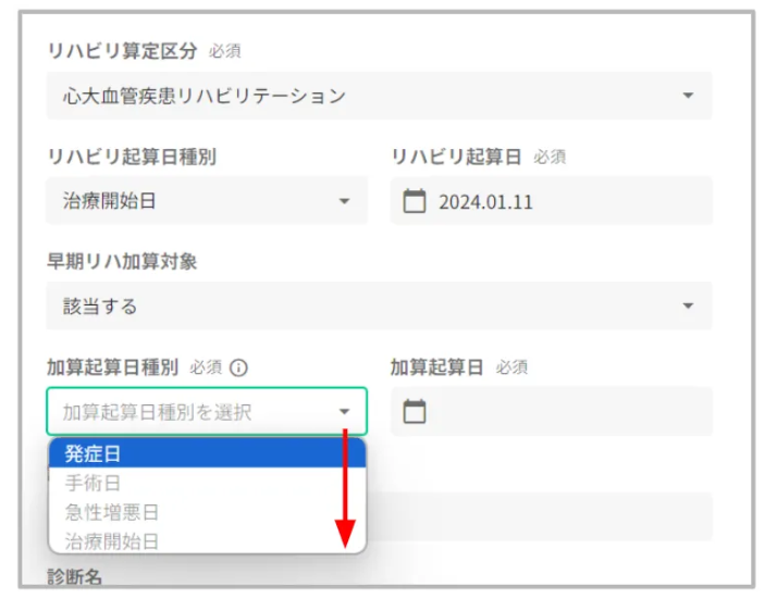 「加算起算日種別」欄の選択肢は、「リハビリ算定区分」の疾患別リハビリテーションによって表示項目が異なります。