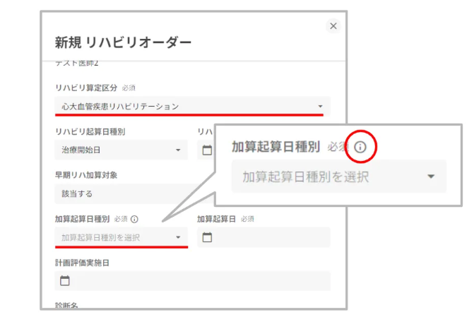 「早期リハ加算対象」欄で「該当する」を選択した場合、「加算起算日種別」欄と「加算起算日」欄を表示いたします。