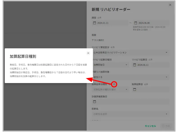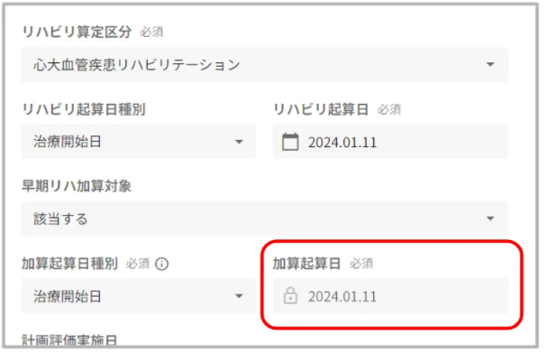 「加算起算日種別=リハビリ起算日種別」となっている場合、「加算起算日」は「リハビリ起算日」と同じ日付を自動設定いたします。この際、「加算起算日」は閲覧専用となり変更はできませんのでご留意ください。