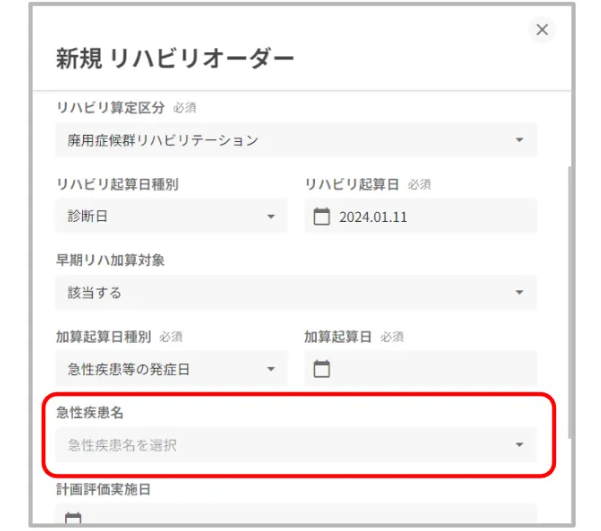「廃用症候群リハビリテーション」であり、早期リハビリテーション加算の対象となる場合は、加算起算日種別欄で「急性疾患等の発症日」「急性疾患等の手術日」「急性疾患等の急性増悪日」のいずれかを選択すると、急性期疾患名を入力する欄が表示されます。