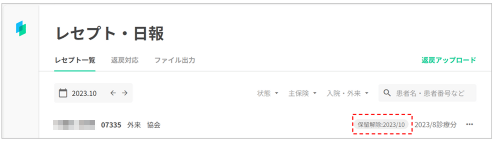 3.保留解除を行ったレセプトデータに「保留解除:YYYY/MM」と表示されます。