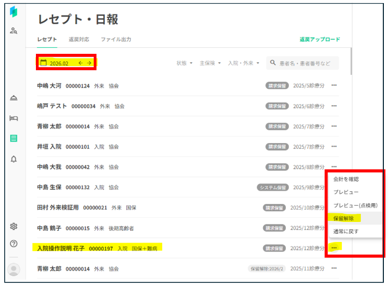 一覧に表示されている「請求保留」状態のレセプトの「…」を押下し、 **「保留解除」**を選択します
