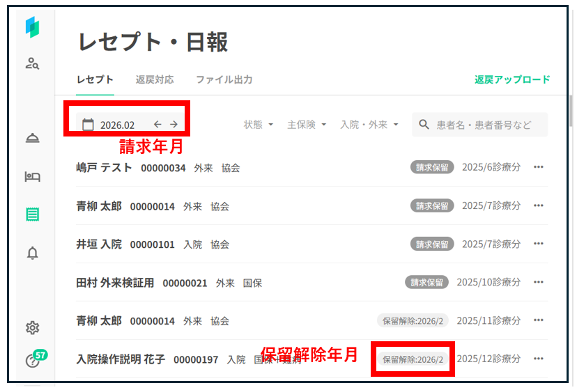 ※UKE生成後のレセプトは、診療月の翌月のレセプト一覧に表示されます。※請求保留を行わない場合は、表示された月の請求対象となります。
