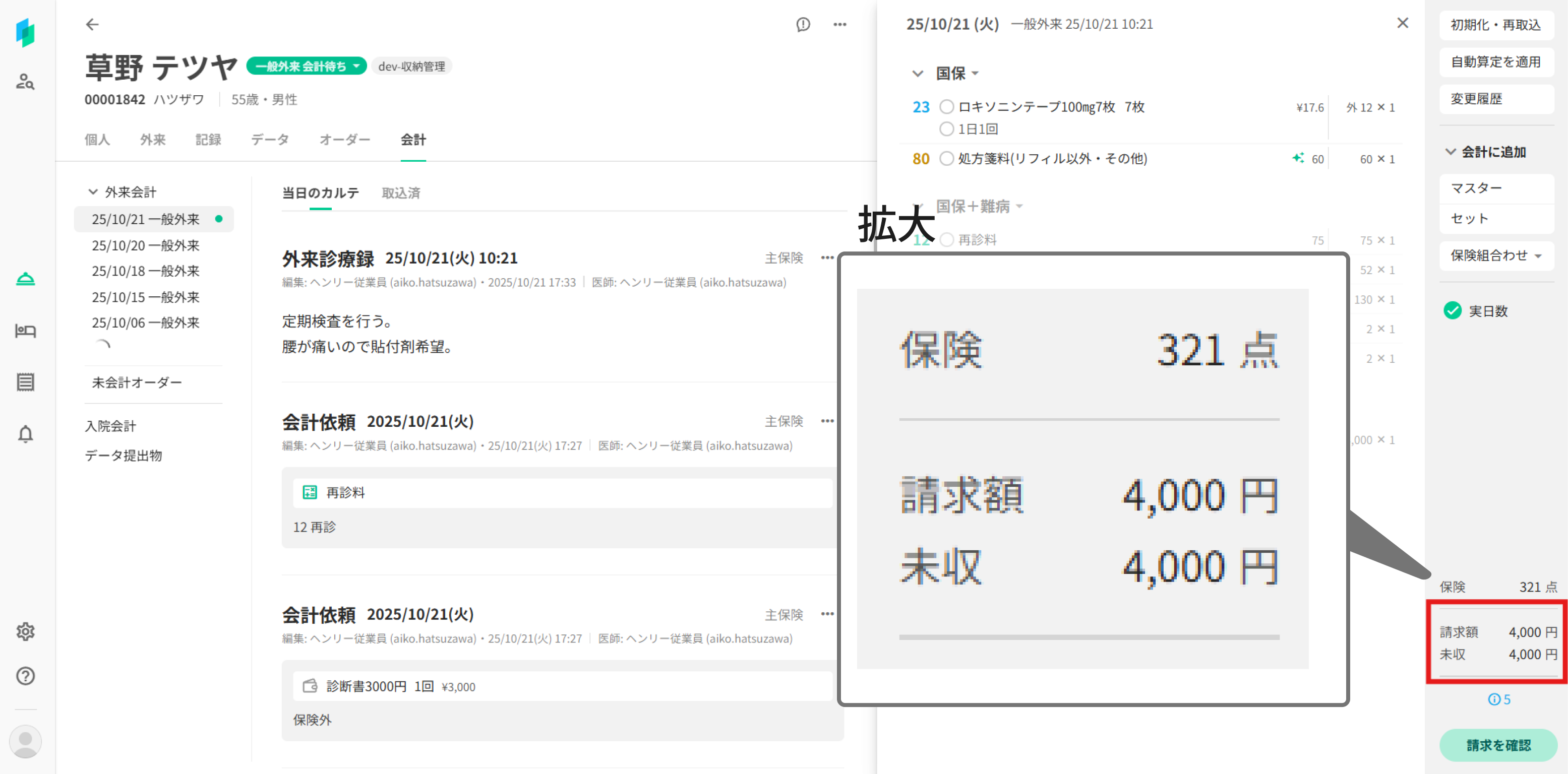 会計一覧から会計画面を開き、右下の「請求を確認」をクリックします