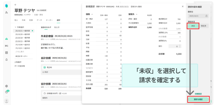 「領収状況」欄の「未収」を選択して「請求を確定」ボタンをクリックします
