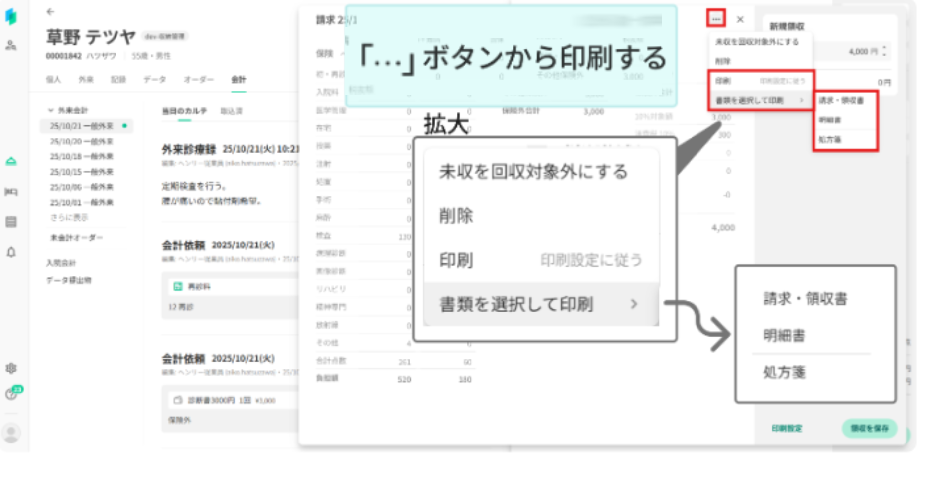 「請求・領収」画面上部の「 ⋯」 ボタンから以下のいずれかを選択し印刷ください