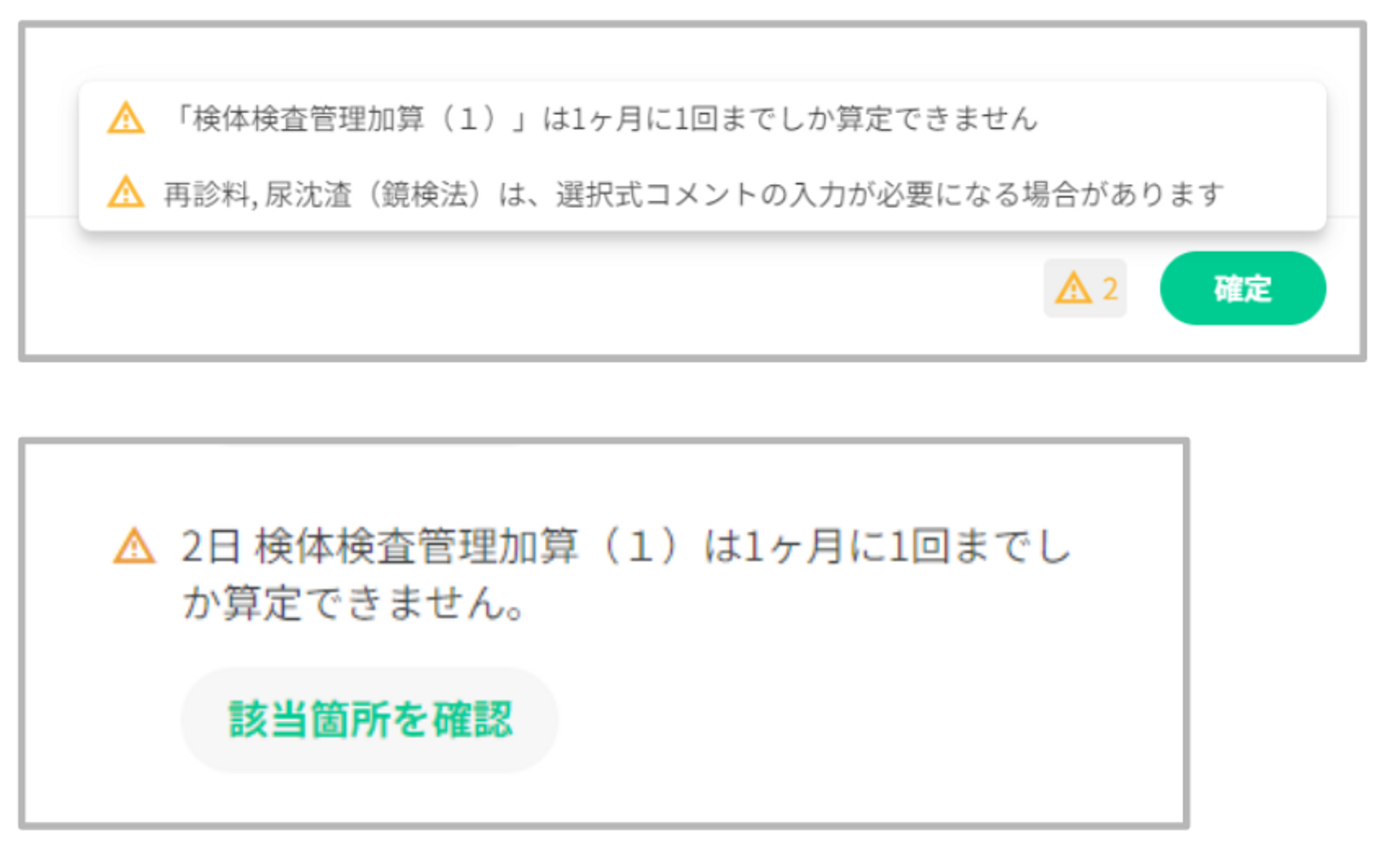現状の仕様では外来の自動算定時に入院の算定履歴を参照することに対応していないため、同月に外来と入院を跨いで算定する場合は、「外来が先」か「入院が先」かで自動算定の挙動が異なります。そのため、一部手修正でご対応いただきますようお願い申し上げます。