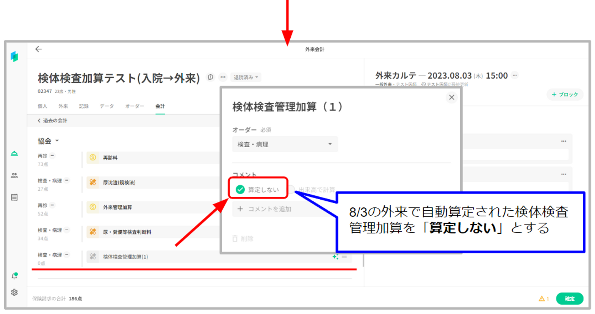 既に同月の外来で「検体検査管理加算」を算定している場合や、手入力で追加した場合は重複して自動算定されることはありません。
