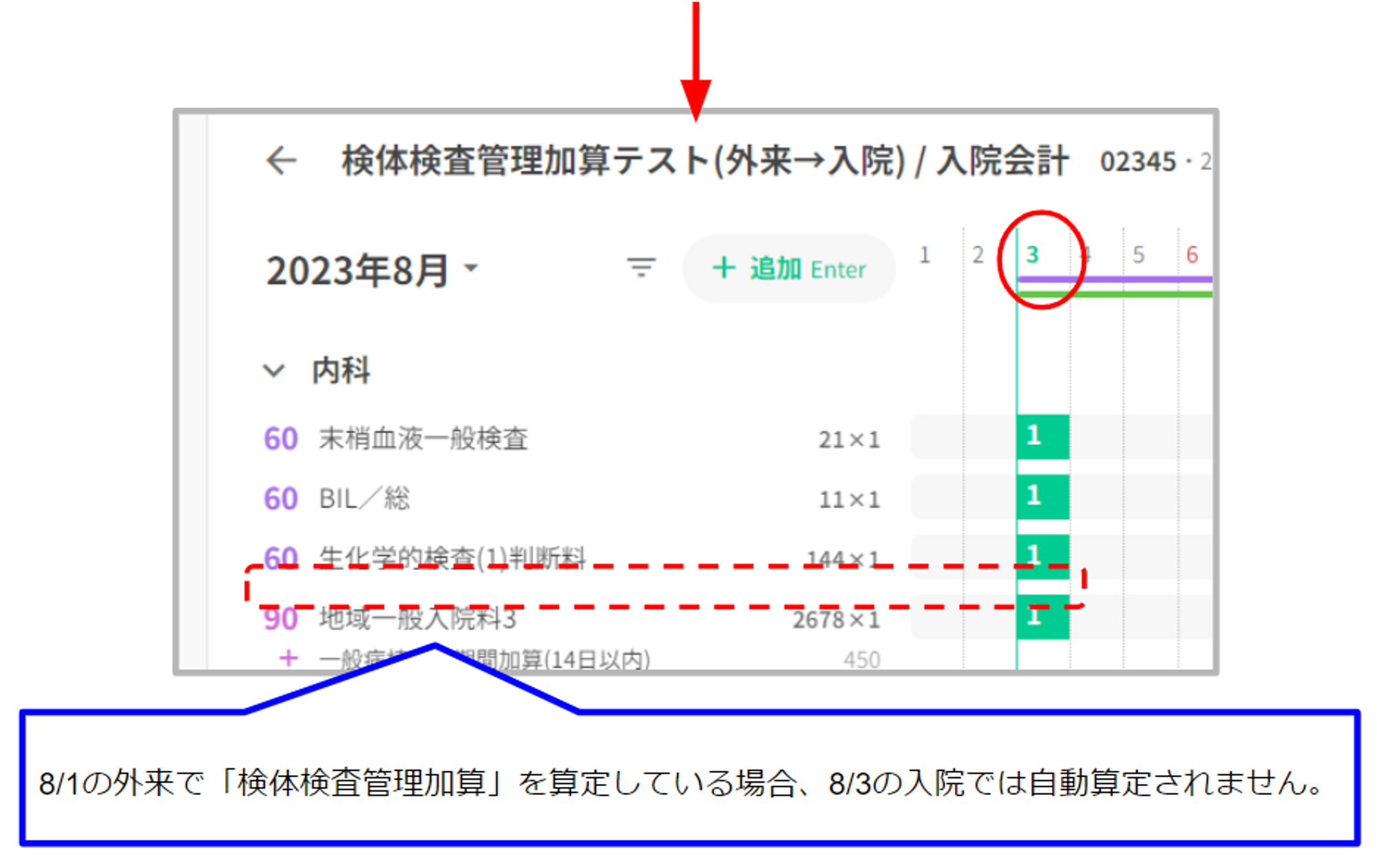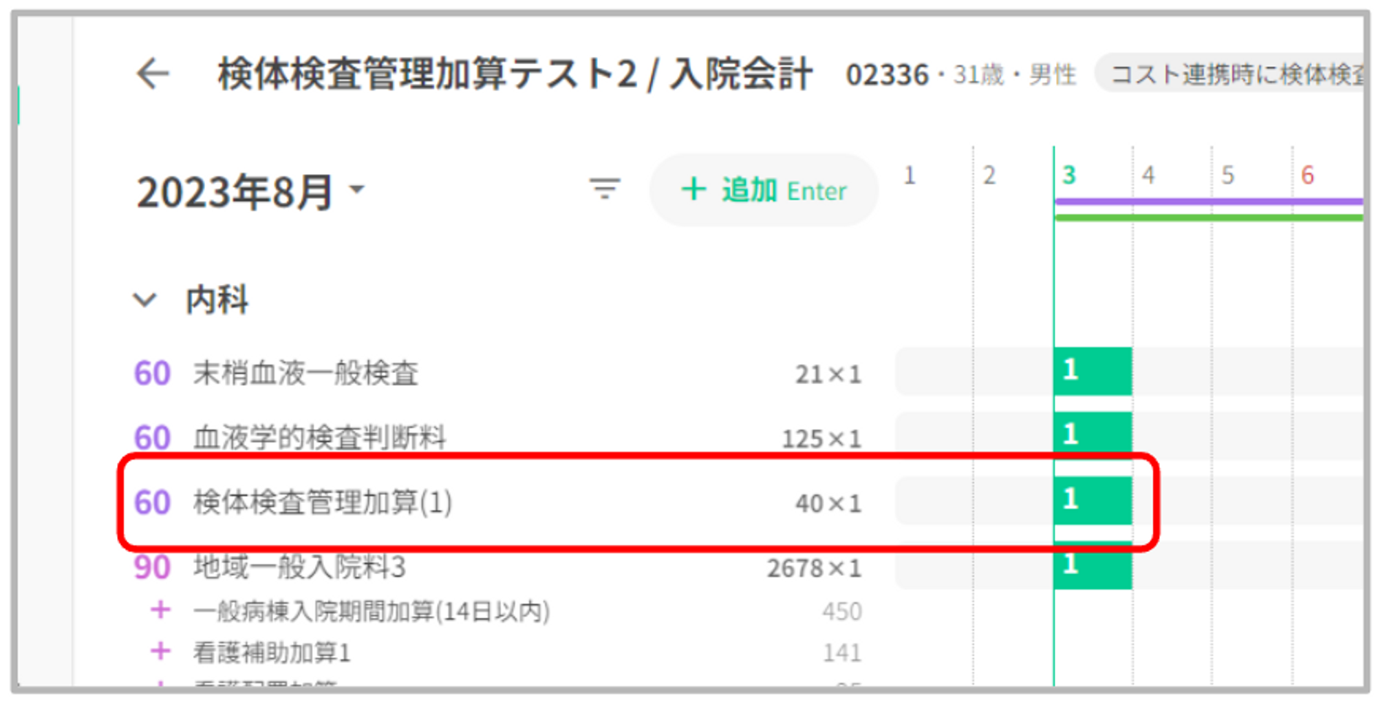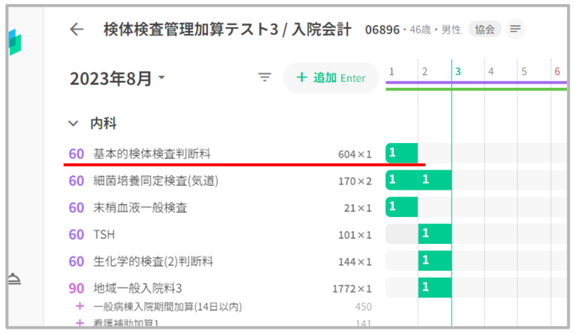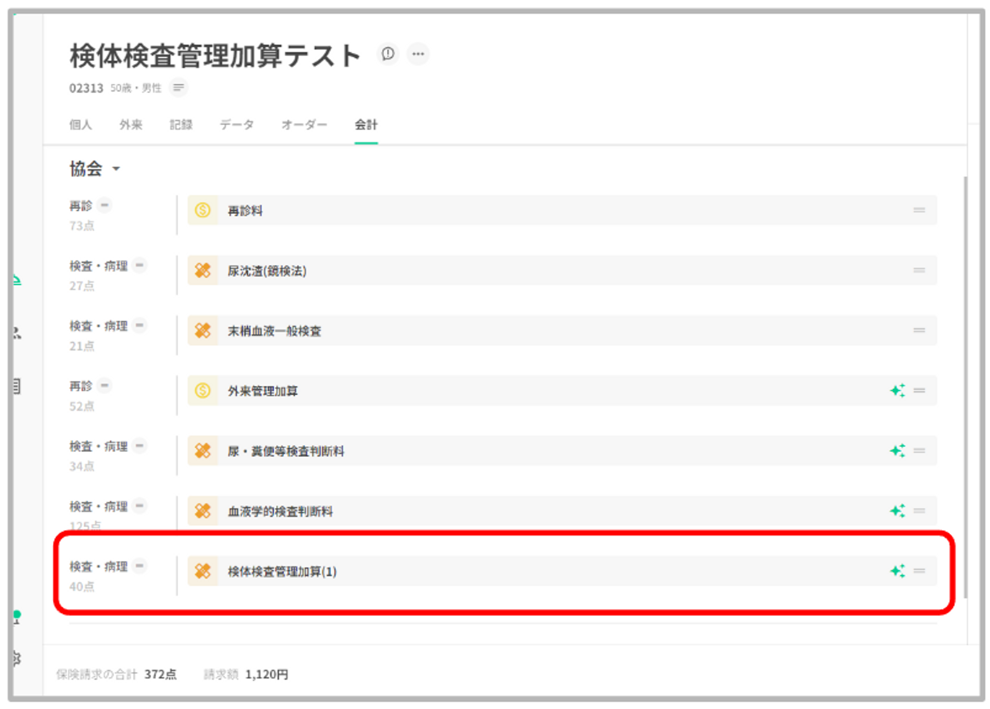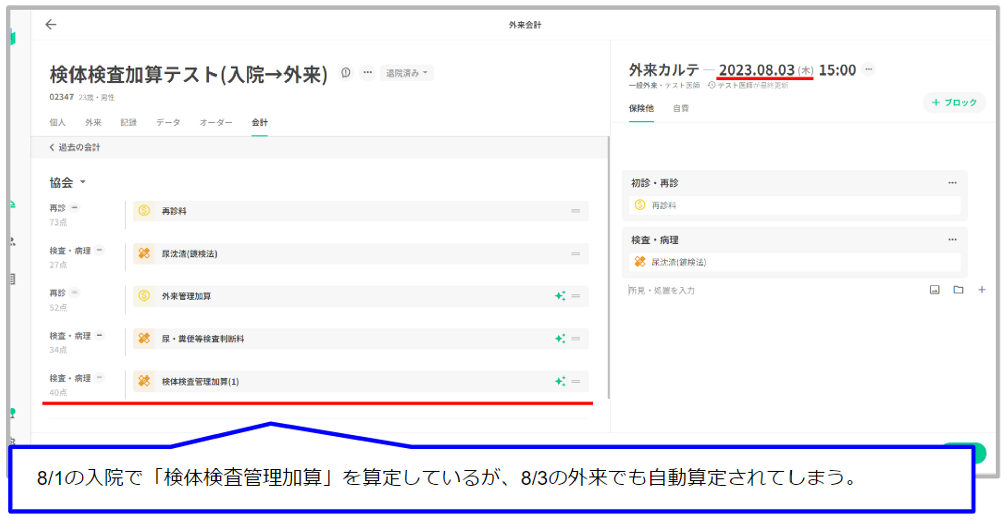 既に同月の入院で「検体検査管理加算」を算定している場合や、手入力で追加した場合は重複して自動算定されることはありません。