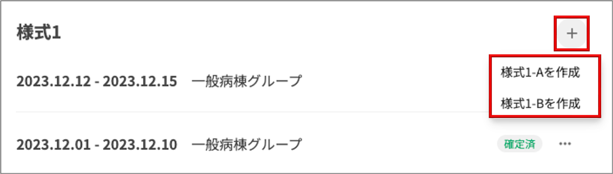 1 . 様式1一覧画面にて「+」ボタンをクリックし、「様式1-Aを作成」「様式1-Bを作成」をクリックします。