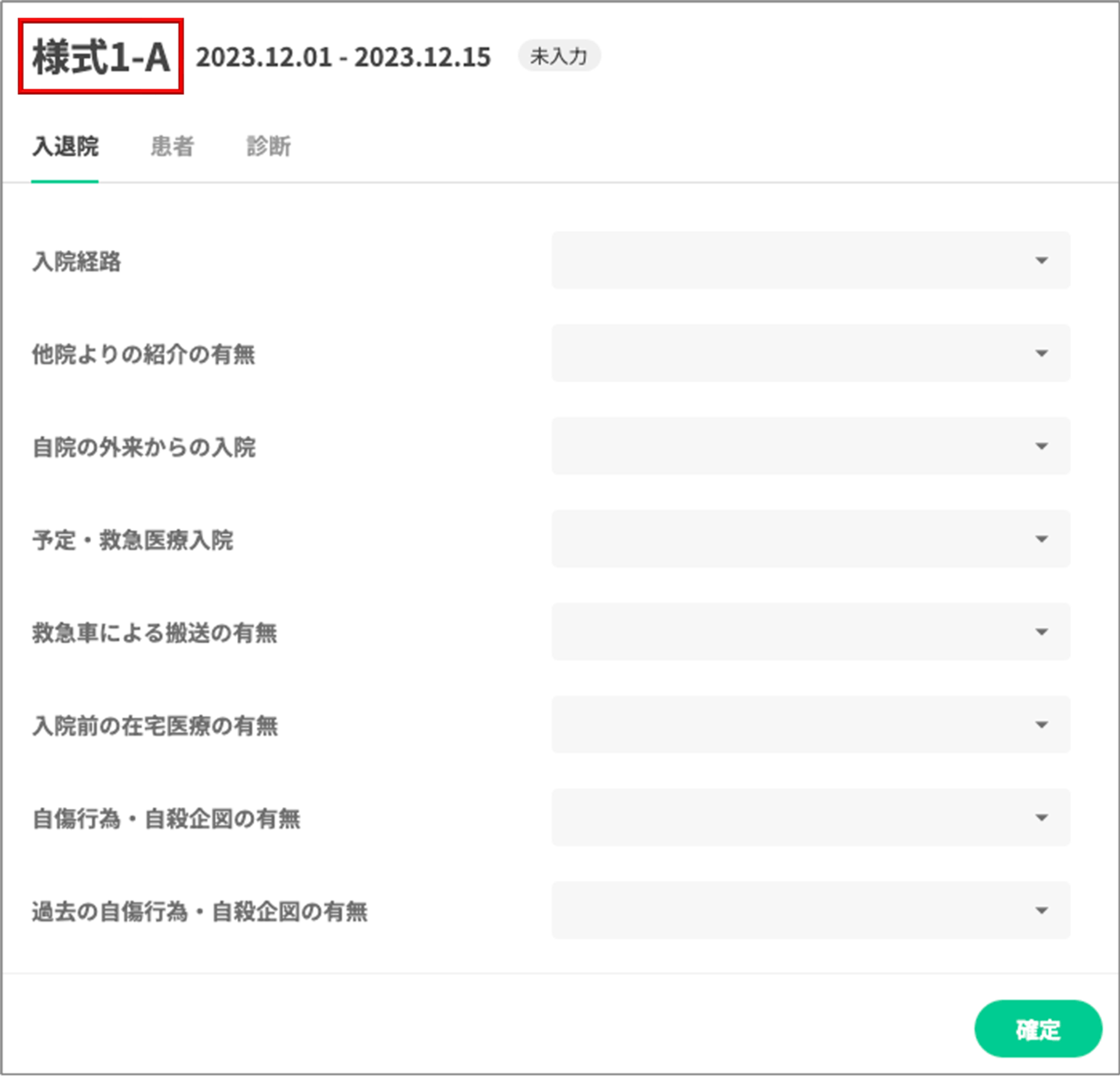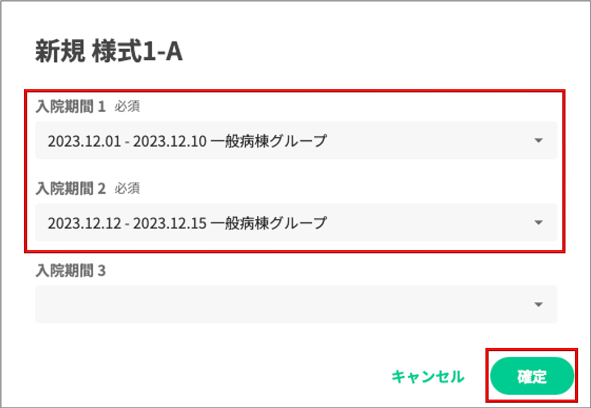 2 . A様式/B様式の作成対象となる入院期間を選択し、「確定」ボタンをクリックします。