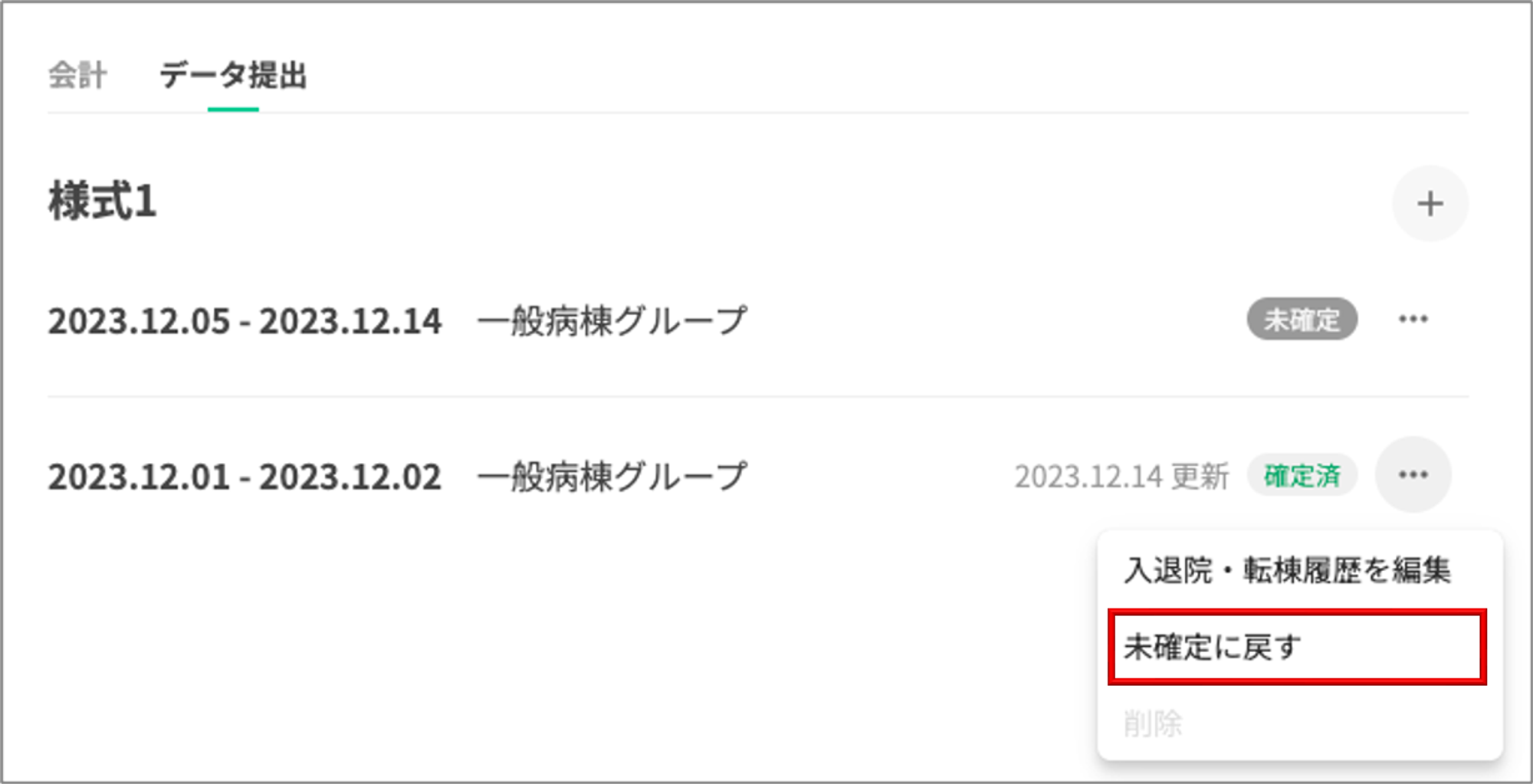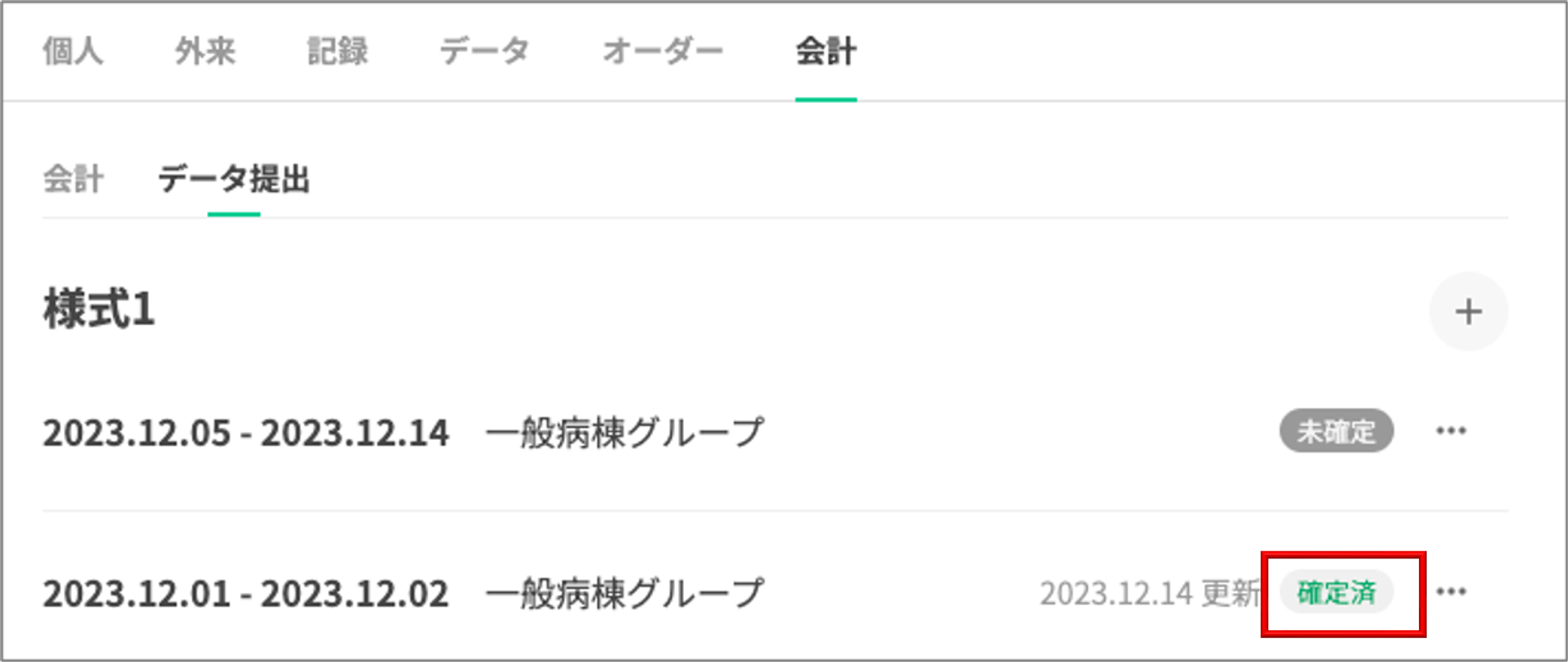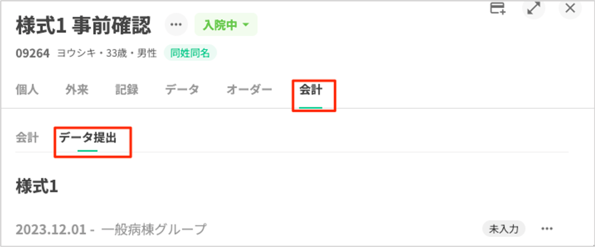 様式1の入力画面は、患者の「会計」-「データ提出」タブにあります。