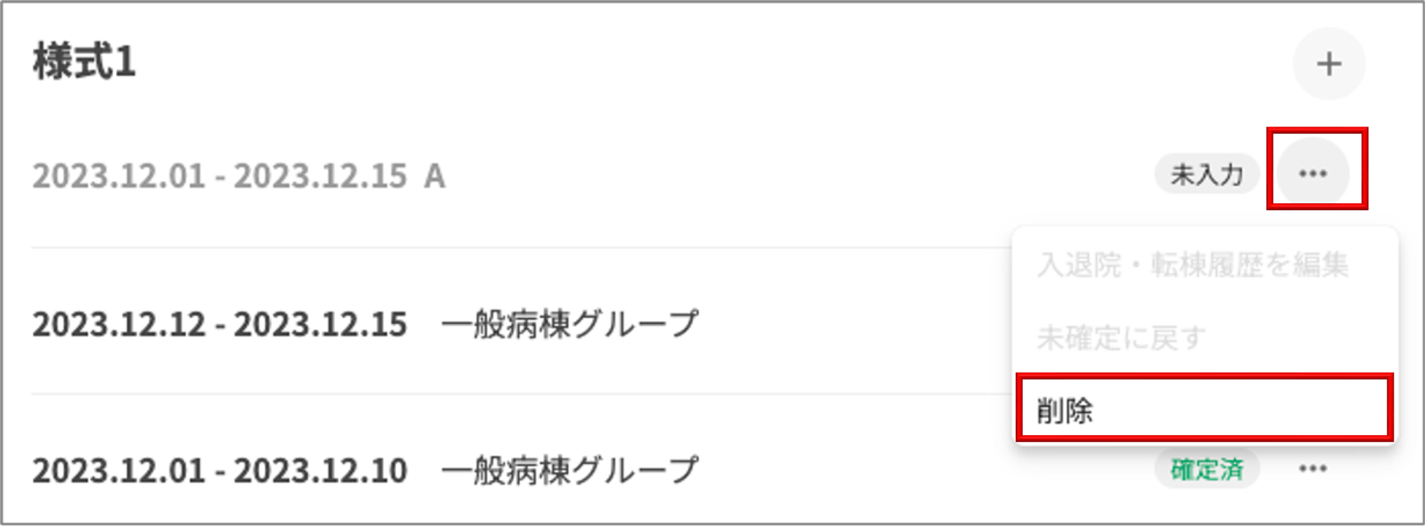 1 . 様式1 一覧画面にて、削除したい様式の三点リーダーアイコン(・・・)をクリックし、「削除」をクリックします。