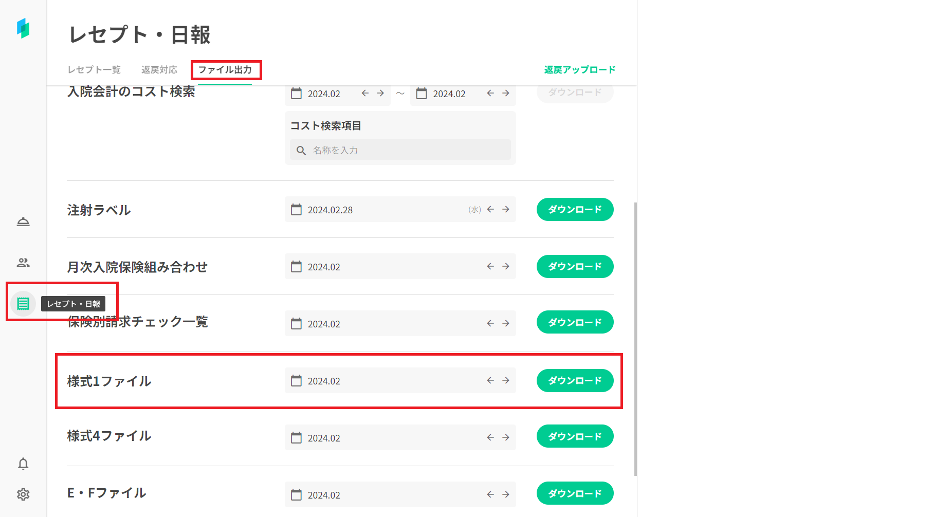 様式1ファイルは、「レセプト・日報」→「ファイル出力」より出力できます。
