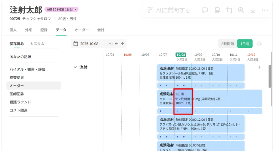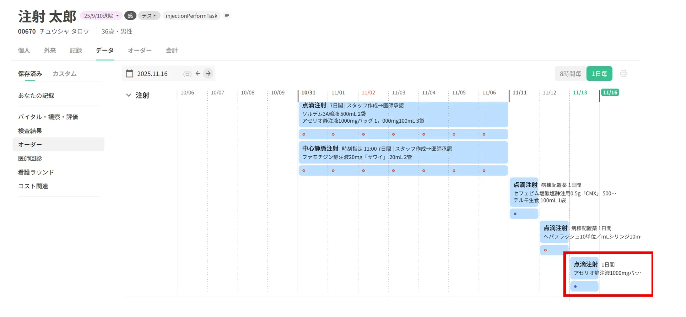 データタブにて注射オーダーを表示します