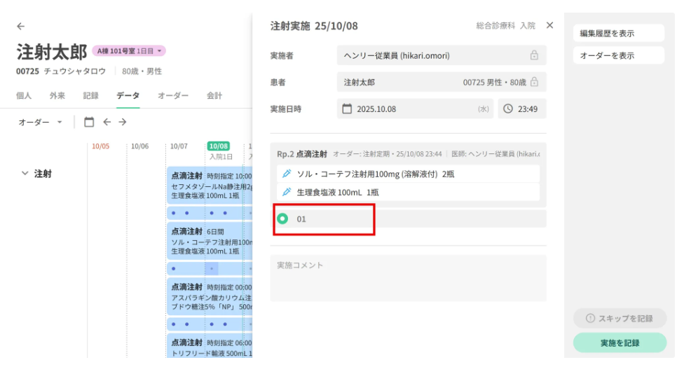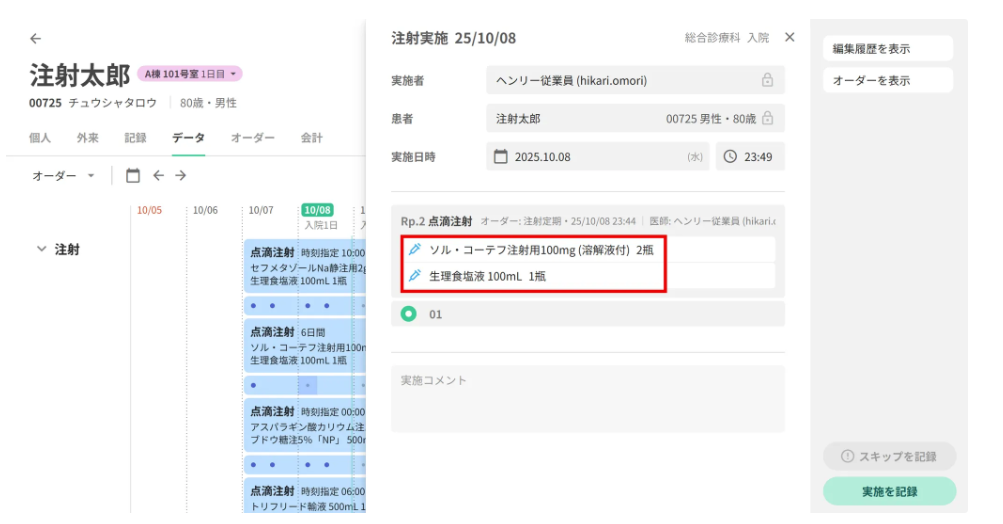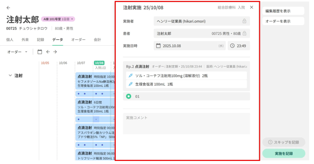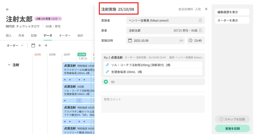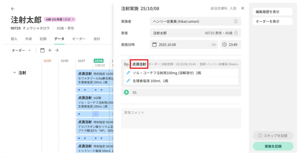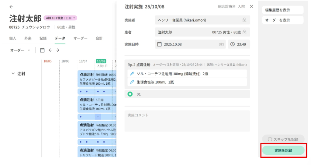急変時対応で後追い入力を行う場合や、オーダー直後に投与する場合など、場面に応じてオーダー時点で「実施済」を選択することが可能です。これにより、処方監査や実施タスクを省略しつつ、実施記録を残すことができます。